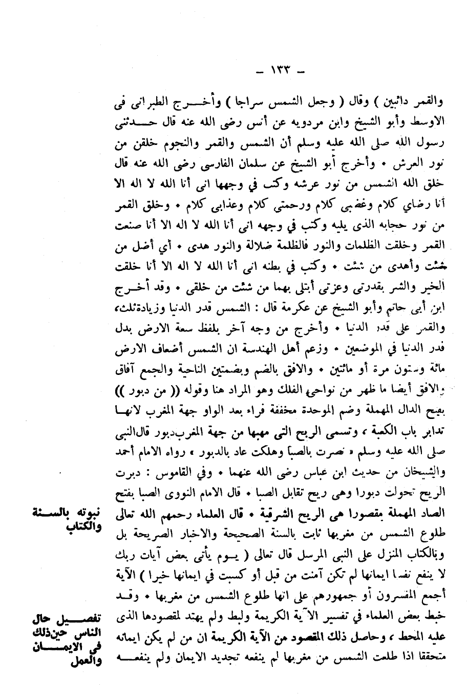 قَالَ الْعُلَمَاءُ رَحِمَهُمُ اللَّهُ تَعَالَى طُلُوعُ الشَّمْسِ مِنْ مَغْرِبِهَا ثَابِتٌ بِالسُّنَّةِ الصَّحِيحَةِ، وَالْأَخْبَارِ الصَّرِيحَةِ بَلْ وَبِالْكِتَابِ الْمُنَزَّلِ عَلَى النَّبِيِّ الْمُرْسَلِ قَالَ تَعَالَى: {يَوْمَ يَأْتِي بَعْضُ آيَاتِ رَبِّكَ لَا يَنْفَعُ نَفْسًا إِيمَانُهَا لَمْ تَكُنْ آمَنَتْ مِنْ قَبْلُ أَوْ كَسَبَتْ فِي إِيمَانِهَا خَيْرًا} [الأنعام: 158] الْآيَةَ. أَجْمَعَ الْمُفَسِّرُونَ أَوْ جُمْهُورُهُمْ عَلَى أَنَّهَا طُلُوعُ الشَّمْسِ مِنْ مَغْرِبِهَا.