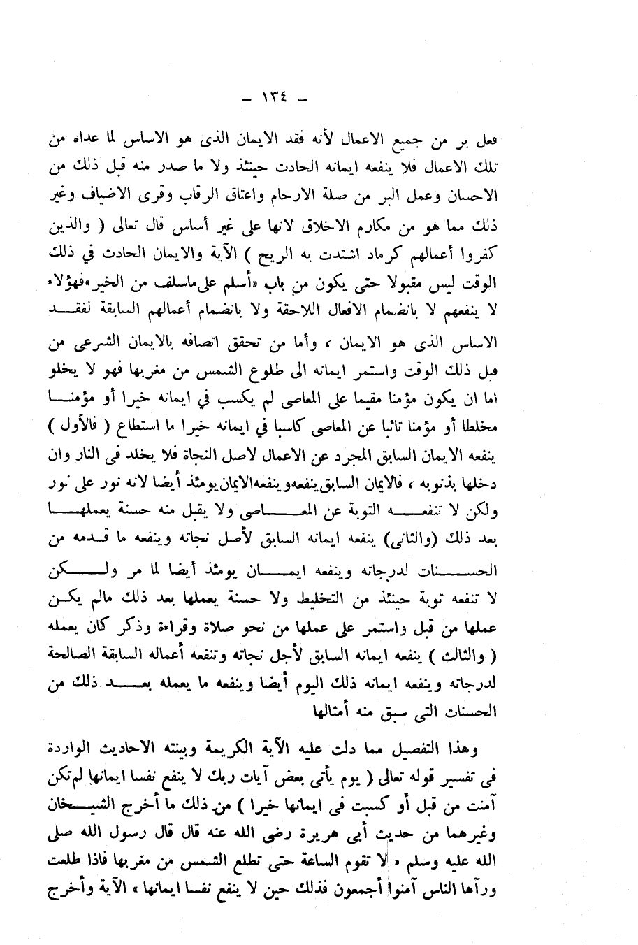 وَالْإِيمَانُ الْحَادِثُ فِي ذَلِكَ الْوَقْتِ لَيْسَ مَقْبُولًا حَتَّى يَكُونَ مِنْ بَابِ " أَسْلِمْ عَلَى مَا سَلَفَ مِنَ الْخَيْرِ) فَهَؤُلَاءِ لَا يَنْفَعُهُمْ لَا بِانْضِمَامِ الْأَفْعَالِ اللَّاحِقَةِ وَلَا بِانْضِمَامِ أَعْمَالِهِمُ السَّابِقَةِ لِفَقْدِ الْأَسَاسِ الَّذِي هُوَ الْإِيمَانُ، وَأَمَّا مَنْ تَحَقَّقَ اتِّصَافُهُ بِالْإِيمَانِ الشَّرْعِيِّ مِنْ قَبْلِ ذَلِكَ الْوَقْتِ وَاسْتَمَرَّ إِيمَانُهُ إِلَى طُلُوعِ الشَّمْسِ مِنْ مَغْرِبِهَا فَهُوَ لَا يَخْلُو إِمَّا أَنْ يَكُونَ مُؤْمِنًا مُقِيمًا عَلَى الْمَعَاصِي لَمْ يَكْسِبْ فِي إِيمَانِهِ خَيْرًا أَوْ مُؤْمِنًا مُخَلَّطًا أَوْ مُؤْمِنًا تَائِبًا عَنِ الْمَعَاصِي كَاسِبًا فِي إِيمَانِهِ خَيْرًا مَا اسْتَطَاعَ، (فَالْأَوَّلُ) يَنْفَعُهُ الْإِيمَانُ السَّابِقُ الْمُجَرَّدُ مِنَ الْأَعْمَالِ لِأَصِلِ النَّجَاةِ فَلَا يَخْلُدُ فِي النَّارِ وَإِنْ دَخَلَهَا بِذُنُوبِهِ، فَالْإِيمَانُ السَّابِقُ يَنْفَعُهُ وَيَنْفَعُهُ الْإِيمَانُ يَوْمَئِذٍ أَيْضًا لِأَنَّهُ نُورٌ عَلَى نُورٍ وَلَكِنْ لَا تَنْفَعُهُ التَّوْبَةُ عَنِ الْمَعَاصِي وَلَا يَقْبَلُ مِنْهُ حَسَنَةً يَعْمَلُهَا بَعْدَ ذَلِكَ.