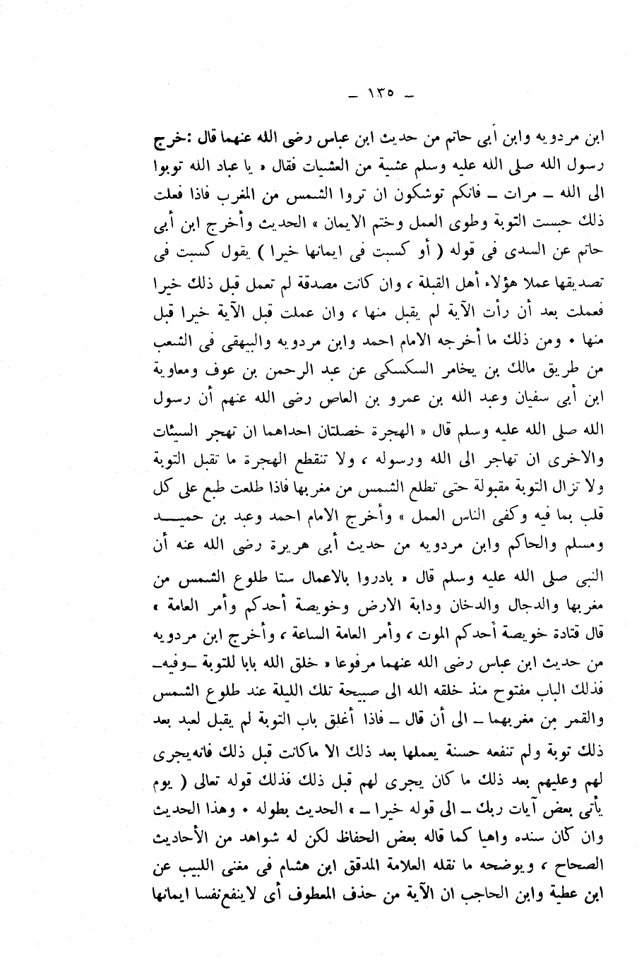 وَهَذَا الْحَدِيثُ وَإِنْ كَانَ سَنَدُهُ وَاهِيًا كَمَا قَالَ بَعْضُ الْحُفَّاظِ لَكِنَّ لَهُ شَوَاهِدَ مِنَ الْأَحَادِيثِ الصِّحَاحِ، وَيُوَضِّحُهُ مَا نَقَلَهُ الْعَلَّامَةُ الْمُدَقِّقُ ابْنُ هِشَامٍ فِي مُغْنِي اللَّبِيبِ عَنِ ابْنِ عَطِيَّةَ، وَابْنِ الْحَاجِبِ أَنَّ الْآيَةَ مِنْ حَذْفِ الْمَعْطُوفِ أَيْ لَا يَنْفَعُ نَفْسًا إِيمَانُهَا
