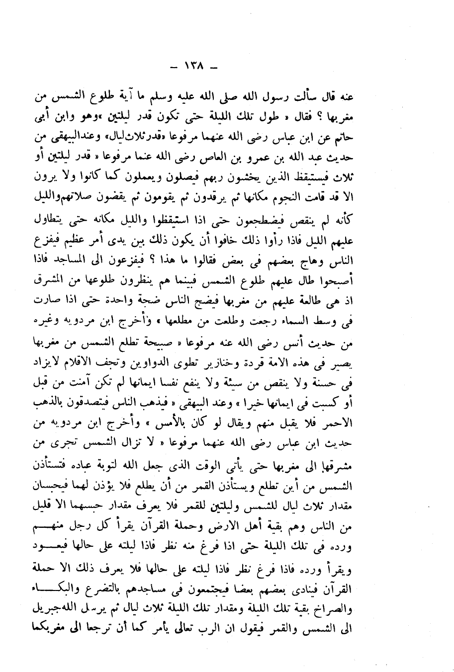 عَنْهُ قَالَ سَأَلْتُ رَسُولَ اللَّهِ صَلَّى اللَّهُ عَلَيْهِ وَسَلَّمَ مَا آيَةُ طُلُوعِ الشَّمْسِ مِنْ مَغْرِبِهَا؟ فَقَالَ " «طُولُ تِلْكَ اللَّيْلَةِ حَتَّى تَكُونَ قَدْرَ لَيْلَتَيْنِ» " وَهُوَ وَابْنُ أَبِي حَاتِمٍ، عَنِ ابْنِ عَبَّاسٍ رَضِيَ اللَّهُ عَنْهُمَا " «قَدْرَ ثَلَاثِ لَيَالٍ» " وَعِنْدَ الْبَيْهَقِيِّ مِنْ حَدِيثِ عَبْدِ اللَّهِ بْنِ عَمْرِو بْنِ الْعَاصِ رَضِيَ اللَّهُ عَنْهُمَا مَرْفُوعًا " «قَدْرَ لَيْلَتَيْنِ أَوْ ثَلَاثٍ فَيَسْتَيْقِظُ الَّذِينَ يَخْشَوْنَ رَبَّهُمْ فَيُصَلُّونَ وَيَعْمَلُونَ كَمَا كَانُوا وَلَا يَرَوْنَ إِلَّا قَدْ قَامَتِ النُّجُومُ مَكَانَهَا ثُمَّ يَرْقُدُونَ ثُمَّ يَقُومُونَ ثُمَّ يَقْضُونَ صَلَاتَهُمْ وَاللَّيْلُ كَأَنَّهُ لَمْ يَنْقُصْ فَيَضْطَجِعُونَ حَتَّى إِذَا اسْتَيْقَظُوا وَاللَّيْلُ مَكَانَهُ حَتَّى يَتَطَاوَلَ عَلَيْهِمُ اللَّيْلُ فَإِذَا رَأَوْا ذَلِكَ خَافُوا أَنْ يَكُونَ ذَلِكَ بَيْنَ يَدَيْ أَمْرٍ عَظِيمٍ فَيَفْزَعُ النَّاسُ وَهَاجَ بَعْضُهُمْ فِي بَعْضٍ فَقَالُوا مَا هَذَا؟ فَيَفْزَعُونَ إِلَى الْمَسَاجِدِ فَإِذَا أَصْبَحُوا طَالَ عَلَيْهِمْ طُلُوعُ الشَّمْسِ فَبَيْنَمَا هُمْ يَنْظُرُونَ طُلُوعَهَا مِنَ الْمَشْرِقِ إِذْ هِيَ طَالِعَةٌ عَلَيْهِمْ مِنْ مَغْرِبِهَا فَيَضِجُّ النَّاسُ ضَجَّةً وَاحِدَةً حَتَّى إِذَا صَارَتْ فِي وَسَطِ السَّمَاءِ رَجَعَتْ وَطَلَعَتْ مِنْ مَطْلَعِهَا» ".