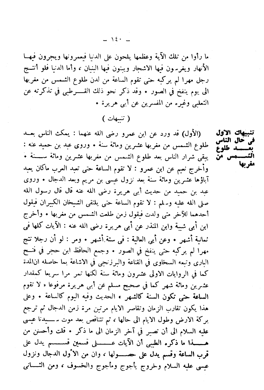 (الْأَوَّلُ) قَدْ وَرَدَ عَنِ ابْنِ عَمْرٍو رَضِيَ اللَّهُ عَنْهُمَا: يَمْكُثُ النَّاسُ بَعْدَ طُلُوعِ الشَّمْسِ مِنْ مَغْرِبِهَا عِشْرِينَ وَمِائَةَ سَنَةٍ.