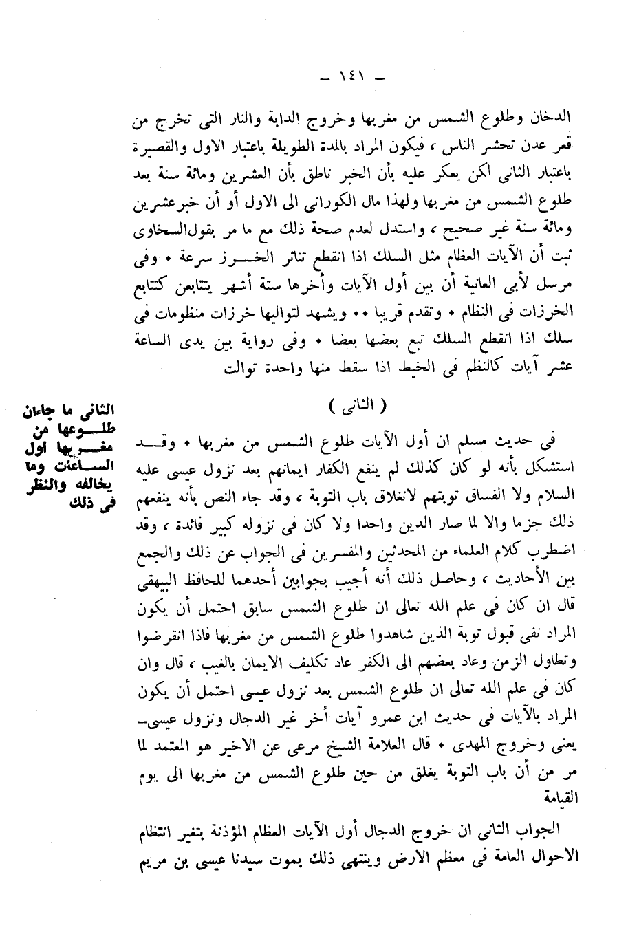الدُّخَانَ، وَطُلُوعَ الشَّمْسِ مِنْ مَغْرِبِهَا، وَخُرُوجَ الدَّابَّةِ، وَالنَّارَ الَّتِي تَخْرُجُ مِنْ قَعْرِ عَدَنَ تَحْشُرُ النَّاسَ، فَيَكُونُ الْمُرَادُ بِالْمُدَّةِ الطَّوِيلَةِ بِاعْتِبَارِ الْأَوَّلِ وَالْقَصِيرَةِ بِاعْتِبَارِ الثَّانِي لَكِنْ يُعَكِّرُ عَلَيْهِ بِأَنَّ الْخَبَرَ نَاطِقٌ بِأَنَّ الْعِشْرِينَ وَمِائَةَ سَنَةً بَعْدَ طُلُوعِ الشَّمْسِ مِنْ مَغْرِبِهَا وَلِهَذَا مَالَ الْكُورَانِيُّ إِلَى الْأَوَّلِ أَوْ أَنَّ خَبَرَ عِشْرِينَ وَمِائَةَ سَنَةٍ غَيْرُ صَحِيحٍ، وَاسْتَدَلَّ لِعَدَمِ صِحَّةِ ذَلِكَ مَعَ مَا مَرَّ بِقَوْلِ السَّخَاوِيِّ ثَبَتَ أَنَّ الْآيَاتِ الْعِظَامَ مِثْلَ السِّلْكِ إِذَا انْقَطَعَ تَنَاثَرَ الْخَرَزُ سُرْعَةً.