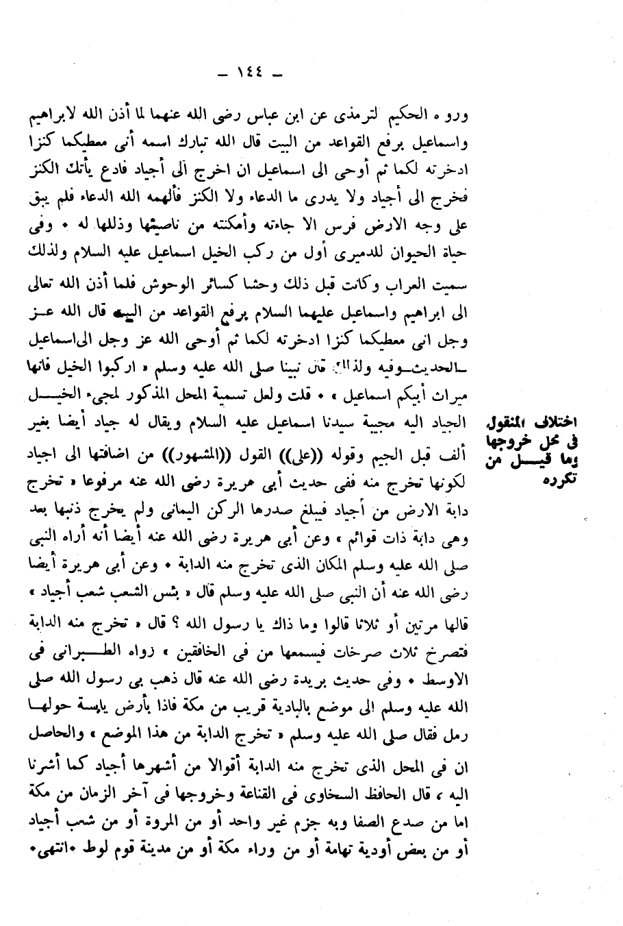 قُلْتُ وَلَعَلَّ تَسْمِيَةَ الْمَحَلِّ الْمَذْكُورِ لِمَجِيءِ الْخَيْلِ الْجِيَادِ إِلَيْهِ مُجِيبَةً سَيِّدَنَا إِسْمَاعِيلَ عَلَيْهِ السَّلَامُ وَيُقَالُ لَهُ جِيَادٌ أَيْضًا بِغَيْرِ أَلْفٍ قَبْلَ الْجِيمِ وَقَوْلُهُ ((عَلَى)) الْقَوْلِ ((الْمَشْهُورِ)) مِنْ إِضَافَتِهَا إِلَى أَجْيَادٍ لِكَوْنِهَا تَخَرُجَ مِنْهُ فَفِي حَدِيثِ أَبِي هُرَيْرَةَ رَضِيَ اللَّهُ عَنْهُ مَرْفُوعًا " «تَخْرُجُ دَابَّةُ الْأَرْضِ مِنْ أَجْيَادٍ فَيَبْلُغُ صَدْرُهَا الرُّكْنَ الْيَمَانِيَّ وَلَمْ يَخْرُجْ ذَنَبُهَا بَعْدُ وَهِيَ دَابَّةٌ ذَاتُ قَوَائِمَ» ".