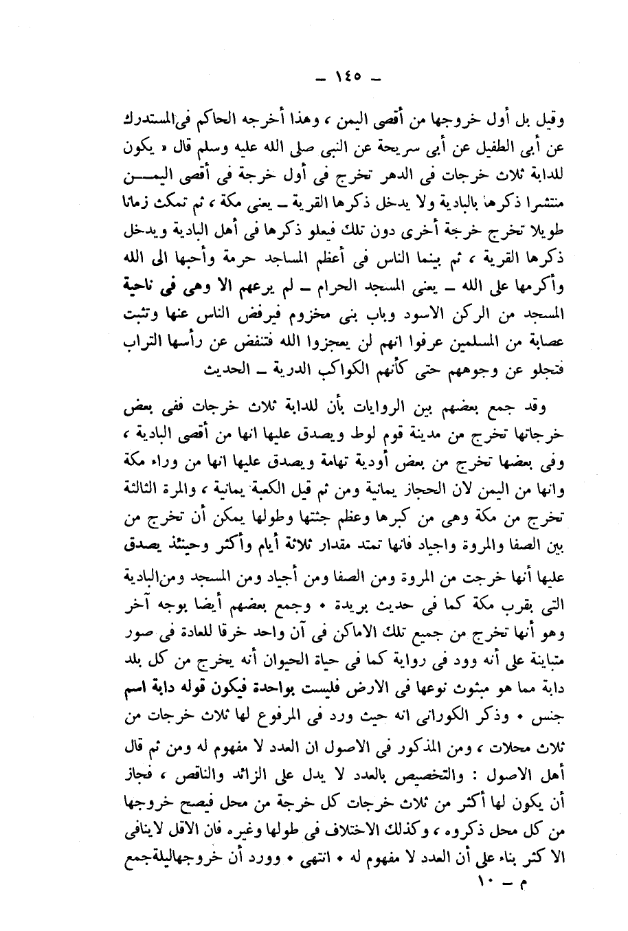 وَقَدْ جَمَعَ بَعْضُهُمْ بَيْنَ الرِّوَايَاتِ بِأَنَّ لِلدَّابَّةِ ثَلَاثُ خُرُجَاتٍ فَفِي بَعْضِ خُرُجَاتِهَا تَخْرُجُ فِي مَدِينَةِ قَوْمِ لُوطٍ وَيَصْدُقُ عَلَيْهَا أَنَّهَا مِنْ أَقْصَى الْبَادِيَةِ، وَفِي بَعْضِهَا تَخْرُجُ مِنْ بَعْضِ أَوْدِيَةِ تِهَامَةَ وَيَصْدُقُ عَلَيْهَا أَنَّهَا مِنْ وَرَاءِ مَكَّةَ وَأَنَّهَا مِنَ الْيَمَنِ لِأَنَّ الْحِجَازَ يَمَانِيَةٌ وَمِنْ ثَمَّ قِيلَ الْكَعْبَةُ يَمَانِيَةٌ، وَالْمَرَّةُ الثَّالِثَةُ تَخْرُجُ مِنْ مَكَّةَ وَهِيَ مِنْ كِبَرِهَا وَعِظَمِ جُثَّتِهَا وَطُولِهَا يُمْكِنُ أَنْ تَخْرُجَ مِنْ بَيْنِ الصَّفَا وَالْمَرْوَةِ وَأَجْيَادٍ فَإِنَّهَا تَمْتَدُّ مِقْدَارَ ثَلَاثَةِ أَيَّامٍ وَأَكْثَرَ وَحِينَئِذٍ يَصْدُقُ عَلَيْهَا أَنَّهَا خَرَجَتْ مِنَ الْمَرْوَةِ وَمِنَ الصَّفَا وَمِنْ أَجْيَادٍ وَمِنَ الْمَسْجِدِ وَمِنَ الْبَادِيَةِ الَّتِي بِقُرْبِ مَكَّةَ كَمَا فِي حَدِيثِ بُرَيْدَةَ.