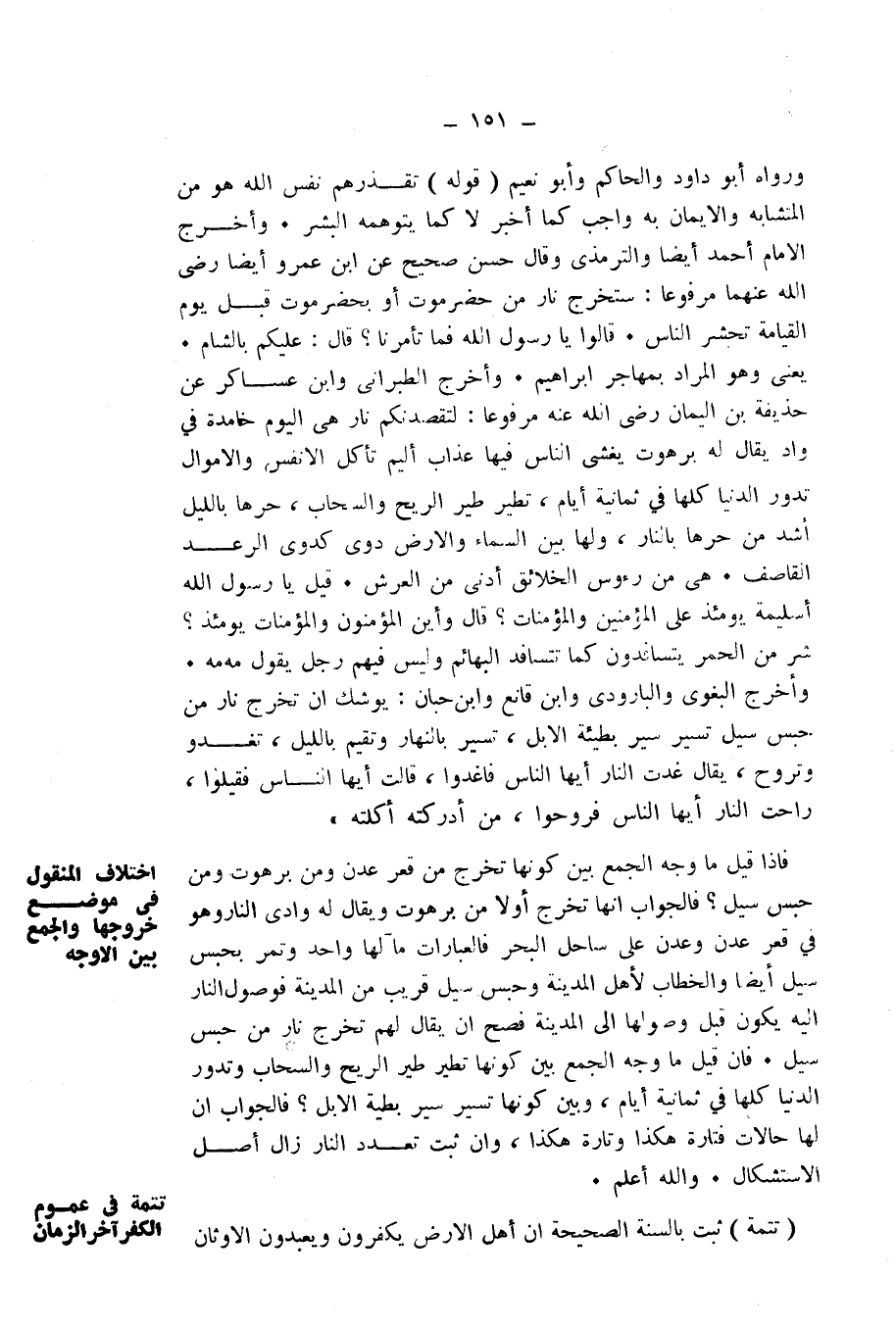 فَإِذَا قِيلَ مَا وَجْهُ الْجَمْعِ بَيْنَ كَوْنِهَا تَخْرُجُ مِنْ قَعْرِ عَدَنَ وَمِنْ بَرْهُوتَ وَمِنْ حَبْسِ سَيْلٍ؟ فَالْجَوَابُ أَنَّهَا تَخْرُجُ أَوَّلًا مِنْ بَرْهُوتَ وَيُقَالُ لَهُ وَادِي النَّارِ وَهُوَ فِي قَعْرِ عَدَنَ وَعَدَنُ عَلَى سَاحِلِ الْبَحْرِ فَالْعِبَارَاتُ مَآلُهَا وَاحِدٌ، وَتَمُرُّ بِحَبْسِ سَيْلٍ أَيْضًا وَالْخِطَابُ لِأَهْلِ الْمَدِينَةِ وَحَبْسُ سَيْلٍ قَرِيبٌ مِنَ الْمَدِينَةِ فَوُصُولُ النَّارِ إِلَيْهِ يَكُونُ قَبْلَ وُصُولِهَا إِلَى الْمَدِينَةِ فَصَحَّ أَنْ يُقَالَ لَهُمْ تَخْرُجُ نَارٌ مِنْ حَبْسِ سَيْلٍ.