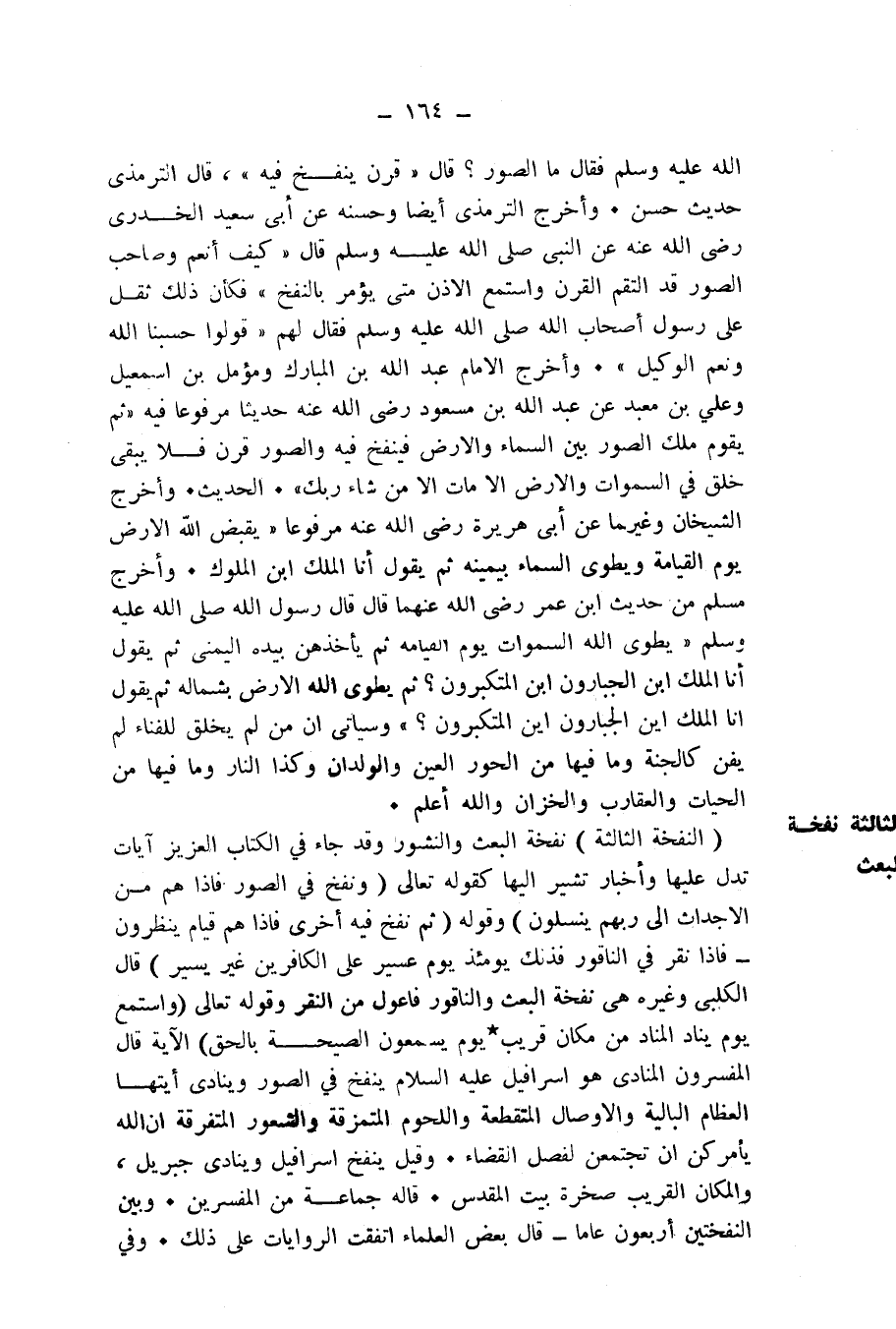 نَفْخَةُ الْبَعْثِ وَالنُّشُورِ، وَقَدْ جَاءَ فِي الْكِتَابِ الْعَزِيزِ آيَاتٌ تَدُلُّ عَلَيْهَا، وَأَخْبَارٌ تُشِيرُ إِلَيْهَا كَقَوْلِهِ تَعَالَى: