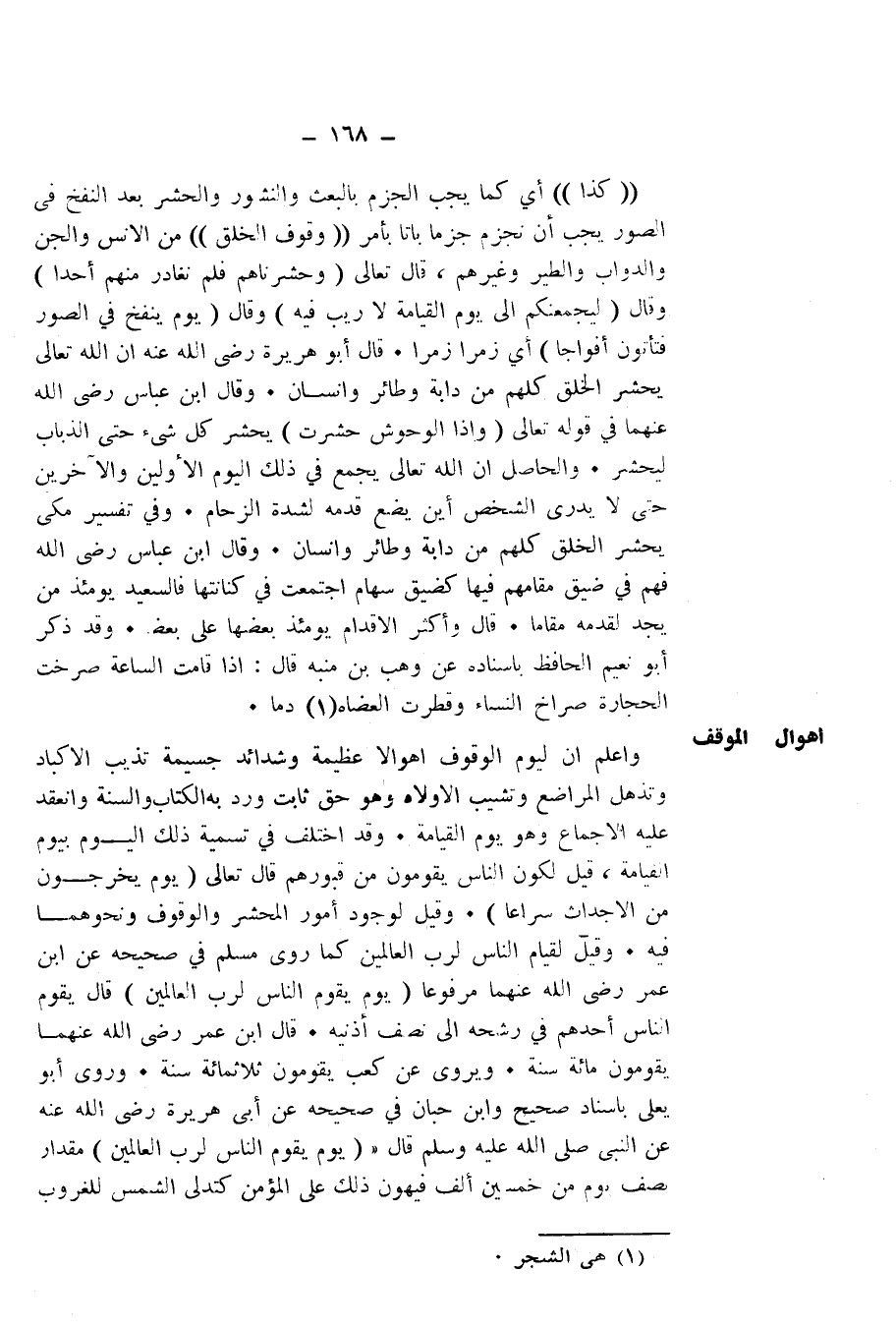 إِذَا قَامَتِ السَّاعَةُ صَرَخَتِ الْحِجَارَةُ صُرَاخَ النِّسَاءِ، وَقَطَرَتِ الْعِضَاةُ دَمًا. وَاعْلَمْ أَنَّ لِيَوْمِ الْوُقُوفِ أَهْوَالًا عَظِيمَةً، وَشَدَائِدَ جَسِيمَةً تُذِيبُ الْأَكْبَادَ وَتُذْهِلُ الْمَرَاضِعَ، وَتُشَيِّبُ الْأَوْلَادَ، وَهُوَ حَقٌّ ثَابِتٌ وَرَدَ بِهِ الْكِتَابُ وَالسُّنَّةُ، وَانْعَقَدَ عَلَيْهِ الْإِجْمَاعُ، وَهُوَ يَوْمُ الْقِيَامَةِ.