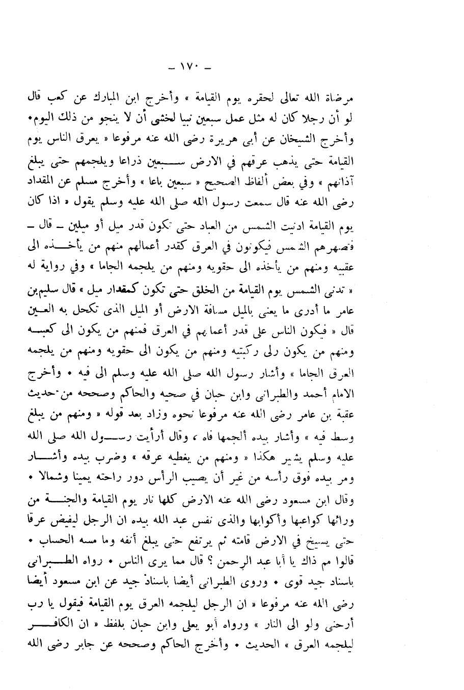 لَوْ أَنَّ رَجُلًا كَانَ لَهُ مِثْلُ عَمَلِ سَبْعِينَ نَبِيًّا لَخَشِيَ أَنْ لَا يَنْجُوَ مِنْ ذَلِكَ الْيَوْمِ، وَأَخْرَجَ الشَّيْخَانِ عَنْ أَبِي هُرَيْرَةَ - رَضِيَ اللَّهُ عَنْهُ - مَرْفُوعًا " «يَعْرَقُ النَّاسُ يَوْمَ الْقِيَامَةِ حَتَّى يَذْهَبَ عَرَقُهُمْ فِي الْأَرْضِ سَبْعِينَ ذِرَاعًا، وَيُلْجِمُهُمْ حَتَّى يَبْلُغَ آذَانَهُمْ» "، وَفِي بَعْضِ أَلْفَاظِ الصَّحِيحِ " سَبْعِينَ بَاعًا " وَأَخْرَجَ مُسْلِمٌ عَنِ الْمِقْدَادِ - رَضِيَ اللَّهُ عَنْهُ - قَالَ سَمِعْتُ رَسُولَ اللَّهِ - صَلَّى اللَّهُ عَلَيْهِ وَسَلَّمَ - يَقُولُ " «إِذَا كَانَ يَوْمُ الْقِيَامَةِ أُدْنِيَتِ الشَّمْسُ مِنَ الْعِبَادِ حَتَّى تَكُونَ قَدْرَ مِيلٍ أَوْ مِيلَيْنِ قَالَ: فَتَصْهَرُهُمُ الشَّمْسُ فَيَكُونُونَ فِي الْعَرَقِ كَقَدْرِ أَعْمَالِهِمْ، مِنْهُمْ مَنْ يَأْخُذُهُ إِلَى عَقِبَيْهِ، وَمِنْهُمْ مَنْ يَأْخُذُهُ إِلَى حَقْوَيْهِ، وَمِنْهُمْ مَنْ يُلْجِمُهُ إِلْجَامًا» " وَفِي رِوَايَةٍ لَهُ " «تُدْنَى الشَّمْسُ يَوْمَ الْقِيَامَةِ مِنَ الْخَلْقِ حَتَّى تَكُونَ كَمِقْدَارِ مِيلٍ» " قَالَ سُلَيْمُ بْنُ عَامِرٍ: