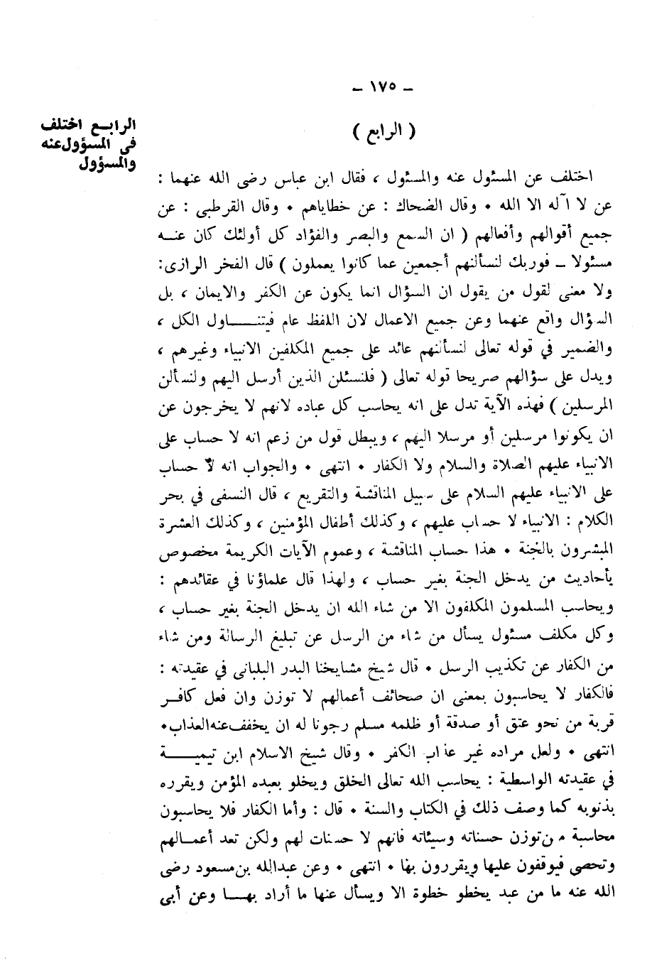 عَنْ جَمِيعِ أَقْوَالِهِمْ وَأَفْعَالِهِمْ {إِنَّ السَّمْعَ وَالْبَصَرَ وَالْفُؤَادَ كُلُّ أُولَئِكَ كَانَ عَنْهُ مَسْئُولًا} [الإسراء: 36]- {فَوَرَبِّكَ لَنَسْأَلَنَّهُمْ أَجْمَعِينَ - عَمَّا كَانُوا يَعْمَلُونَ} [الحجر: 92 - 93] قَالَ الْفَخْرُ الرَّازِيُّ: