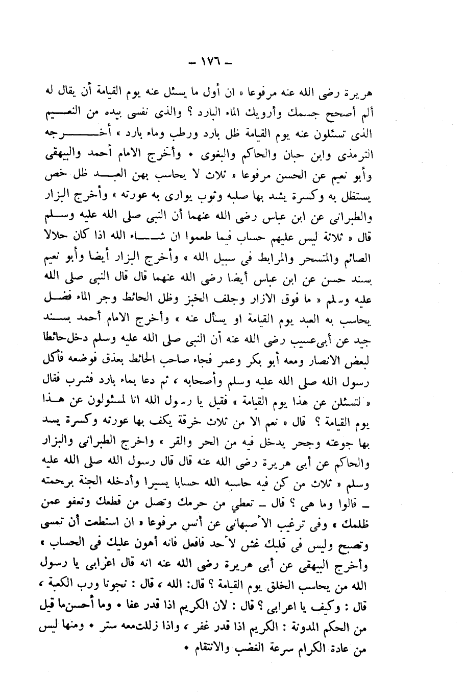 وَأَخْرَجَ الْإِمَامُ أَحْمَدُ وَالْبَيْهَقِيُّ وَأَبُو نُعَيْمٍ عَنِ الْحَسَنِ مَرْفُوعًا: " «ثَلَاثٌ لَا يُحَاسَبُ بِهِنَّ الْعَبْدُ: ظِلُّ خُصٍّ يَسْتَظِلُّ بِهِ، وَكِسْرَةٌ يَشُدُّ بِهَا صُلْبَهُ، وَثَوْبٌ يُوَارِي بِهِ عَوْرَتَهُ» " وَأَخْرَجَ الْبَزَّارُ وَالطَّبَرَانِيُّ عَنِ ابْنِ عَبَّاسٍ رَضِيَ اللَّهُ عَنْهُمَا أَنَّ النَّبِيَّ - صَلَّى اللَّهُ عَلَيْهِ وَسَلَّمَ - قَالَ: " «ثَلَاثَةٌ لَيْسَ عَلَيْهِمْ حِسَابٌ فِيمَا طَعِمُوا إِنْ شَاءَ اللَّهُ إِذَا كَانَ حَلَالًا: الصَّائِمُ وَالْمُتَسَحِّرُ وَالْمُرَابِطُ فَى سَبِيلِ اللَّهِ» " وَأَخْرَجَ الْبَزَّارُ أَيْضًا، وَأَبُو نُعَيْمٍ بِسَنَدٍ حَسَنٍ عَنِ ابْنِ عَبَّاسٍ أَيْضًا - رَضِيَ اللَّهُ عَنْهُمَا - قَالَ: قَالَ النَّبِيُّ - صَلَّى اللَّهُ عَلَيْهِ وَسَلَّمَ - " مَا «فَوْقَ الْإِزَارِ وَجِلْفُ الْخُبْزِ وَظِلُّ الْحَائِطِ وَجَرُّ الْمَاءِ فَضْلٌ يُحَاسَبُ بِهِ الْعَبْدُ يَوْمَ الْقِيَامَةِ أَوْ يُسْأَلُ عَنْهُ» ". وَأَخْرَجَ الْإِمَامُ أَحْمَدُ بِسَنَدٍ جَيِّدٍ عَنْ أَبَى عَسِيبٍ - رَضِيَ اللَّهُ عَنْهُ - «أَنَّ النَّبِيَّ - صَلَّى اللَّهُ عَلَيْهِ وَسَلَّمَ - دَخَلَ حَائِطًا لِبَعْضِ الْأَنْصَارِ وَمَعَهُ أَبُو بَكْرٍ وَعُمَرُ، فَجَاءَ صَاحِبُ الْحَائِطِ بِعَذْقٍ فَوَضَعَهُ، فَأَكَلَ رَسُولُ اللَّهِ - صَلَّى اللَّهُ عَلَيْهِ وَسَلَّمَ - وَأَصْحَابُهُ، ثُمَّ دَعَا بِمَاءٍ بَارِدٍ فَشَرِبَ فَقَالَ: " لَتُسْأَلُنَّ عَنْ هَذَا يَوْمَ الْقِيَامَةِ " فَقِيلَ: يَا رَسُولَ اللَّهِ إِنَّا لَمَسْئُولُونَ عَنْ هَذَا يَوْمَ الْقِيَامَةِ؟ قَالَ: " نَعَمْ إِلَّا مِنْ ثَلَاثٍ: خِرْقَةٍ يَكُفُّ بِهَا عَوْرَتَهُ، وَكِسْرَةٍ يَسُدُّ بِهَا جُوعَتَهُ، وَجُحْرٍ يَدْخُلُ فِيهِ مِنَ الْحَرِّ وَالْقَرِّ» وَأَخْرَجَ الطَّبَرَانِيُّ وَالْبَزَّارُ وَالْحَاكِمُ عَنْ أَبِي هُرَيْرَةَ رَضِيَ اللَّهُ عَنْهُ قَالَ: قَالَ رَسُولُ اللَّهِ - صَلَّى اللَّهُ عَلَيْهِ وَسَلَّمَ - " «ثَلَاثٌ مَنْ كُنَّ فِيهِ حَاسَبَهُ اللَّهُ حِسَابًا يَسِيرًا وَأَدْخَلَهُ الْجَنَّةَ بِرَحْمَتِهِ - قَالُوا: وَمَا هِيَ؟ قَالَ تُعْطِي مَنْ حَرَمَكَ، وَتَصِلُ مَنْ قَطَعَكَ، وَتَعْفُو عَمَّنْ ظَلَمَكَ» ، وَفَى تَرْغِيبِ الْأَصْبَهَانِيِّ عَنْ أَنَسٍ مَرْفُوعًا: " «إِنِ اسْتَطَعْتَ أَنْ تُمْسِيَ وَتُصْبِحَ وَلَيْسَ فَى قَلْبِكَ غِشٌّ لِأَحَدٍ فَافْعَلْ، فَإِنَّهُ أَهْوَنُ عَلَيْكَ فِي الْحِسَابِ» "، وَأَخْرَجَ الْبَيْهَقِيُّ «عَنْ أَبِي هُرَيْرَةَ - رَضِيَ اللَّهُ عَنْهُ - أَنَّهُ قَالَ أَعْرَابِيٌّ: يَا رَسُولَ اللَّهِ مَنْ يُحَاسِبُ الْخَلْقَ يَوْمَ الْقِيَامَةِ؟ قَالَ: اللَّهُ، قَالَ: نَجَوْنَا وَرَبِّ الْكَعْبَةِ، قَالَ: وَكَيْفَ يَا أَعْرَابِيُّ؟ قَالَ: لِأَنَّ الْكَرِيمَ إِذَا قَدَرَ عَفَا. وَمَا أَحْسَنَ مَا قِيلَ مِنَ الْحِكَمِ الْمُدَوَّنَةِ: الْكَرِيمُ إِذَا قَدَرَ غَفَرَ، وَإِذَا زَلَلْتَ مَعَهُ سَتَرَ. وَمِنْهَا: لَيْسَ مِنْ عَادَةِ الْكِرَامِ سُرْعَةُ الْغَضَبِ وَالِانْتِقَامُ» .