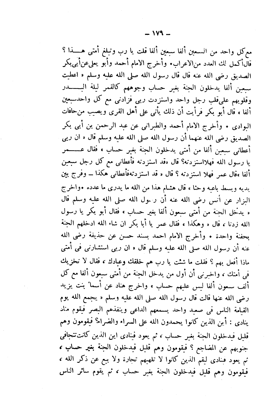وَأَخْرَجَ الْإِمَامُ أَحْمَدُ، وَأَبُو يَعْلَى عَنْ أَبِي بَكْرٍ الصِّدِّيقِ - رَضِيَ اللَّهُ عَنْهُ - قَالَ: «قَالَ رَسُولُ اللَّهِ - صَلَّى اللَّهُ عَلَيْهِ وَسَلَّمَ: " أُعْطِيتُ سَبْعِينَ أَلْفًا يَدْخُلُونَ الْجَنَّةَ بِغَيْرِ حِسَابٍ، وُجُوهُهُمْ كَالْقَمَرِ لَيْلَةَ الْبَدْرِ، وَقُلُوبُهُمْ عَلَى قَلْبِ رَجُلٍ وَاحِدٍ، وَاسْتَزَدْتُ رَبِّي فَزَادَنِي مَعَ كُلِّ وَاحِدٍ سَبْعِينَ أَلْفًا ". قَالَ أَبُو بَكْرٍ: