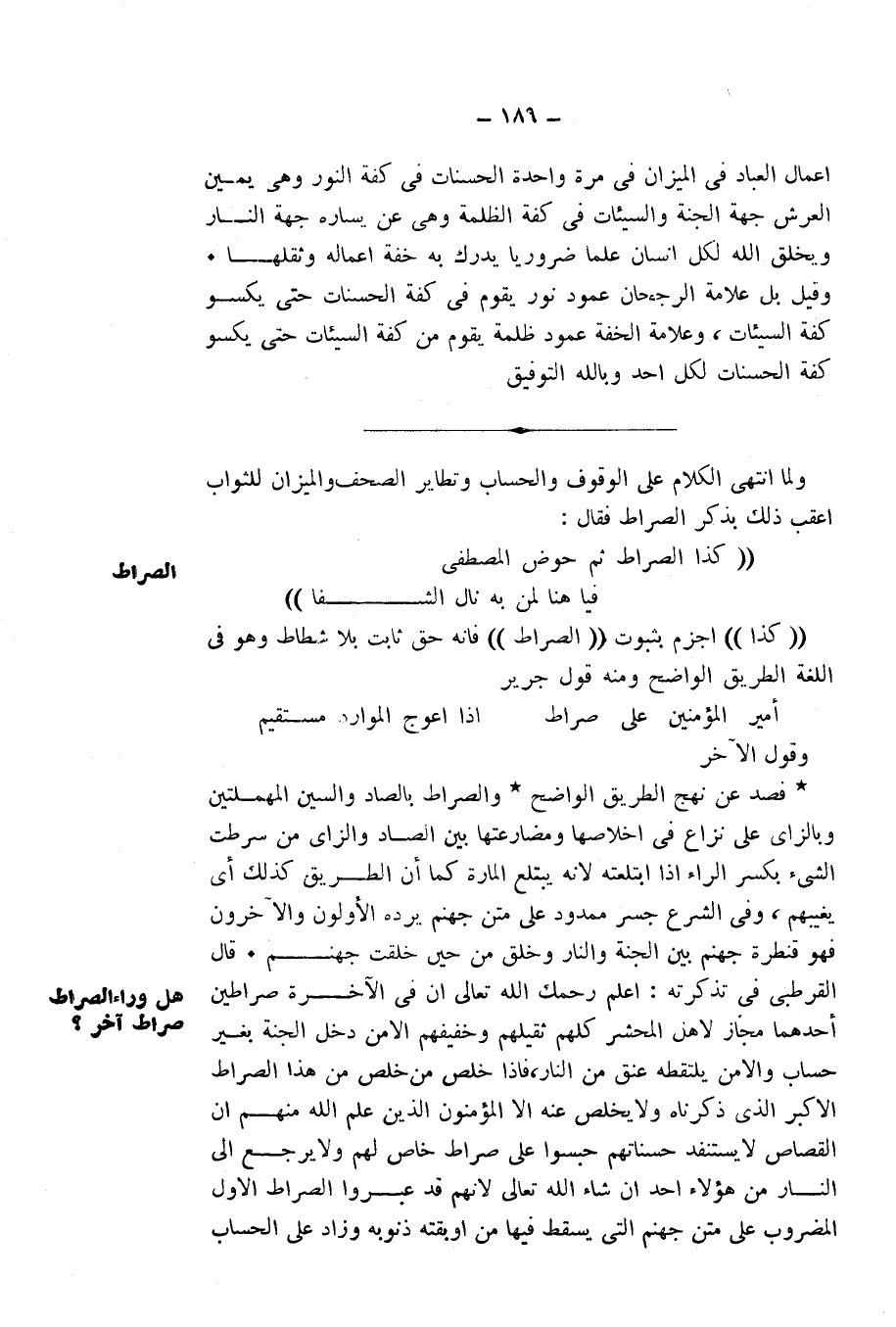 اعْلَمْ رَحِمَكَ اللَّهُ تَعَالَى أَنَّ فِي الْآخِرَةِ صِرَاطَيْنِ أَحَدُهُمَا مَجَازٌ لِأَهْلِ الْمَحْشَرِ كُلِّهِمْ ثَقِيلِهِمْ وَخَفِيفِهِمْ إِلَّا مَنْ دَخَلَ الْجَنَّةَ بِغَيْرِ حِسَابٍ، وَإِلَّا مَنْ يَلْتَقِطُهُ عُنُقٌ مِنَ النَّارِ، فَإِذَا خَلَصَ مَنْ خَلَصَ مِنْ هَذَا الصِّرَاطِ الْأَكْبَرِ الَّذِي ذَكَرْنَاهُ، وَلَا يَخْلُصُ عَنْهُ إِلَّا الْمُؤْمِنُونَ الَّذِينَ عَلِمَ اللَّهُ مِنْهُمْ أَنَّ الْقِصَاصَ لَا يَسْتَنْفِدُ حَسَنَاتِهِمْ حُبِسُوا عَلَى صِرَاطٍ خَاصٍّ لَهُمْ، وَلَا يَرْجِعُ إِلَى النَّارِ مِنْ هَؤُلَاءِ أَحَدٌ إِنْ شَاءَ اللَّهُ تَعَالَى لِأَنَّهُمْ قَدْ عَبَرُوا الصِّرَاطَ الْأَوَّلَ الْمَضْرُوبَ عَلَى مَتْنِ جَهَنَّمَ الَّتِي يَسْقُطُ فِيهَا مَنْ أَبْقَتْهُ ذُنُوبُهُ، وَزَادَ عَلَى الْحِسَابِ
