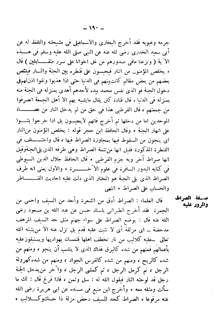 قَالَ الْحَافِظُ جَلَالُ الدِّينِ السُّيُوطِيُّ فِي كِتَابِهِ الْبُدُورِ السَّافِرَةِ فِي عُلُومِ الْآخِرَةِ: وَالْأَوَّلُ يَعْنِي أَنَّهُ طَرَفُ الصِّرَاطِ الَّذِي يَلِي الْجَنَّةَ هُوَ الْمُخْتَارُ الَّذِي دَلَّتْ عَلَيْهِ أَحَادِيثُ الْقَنَاطِرِ وَالْحِسَابِ عَلَى الصِّرَاطِ. انْتَهَى