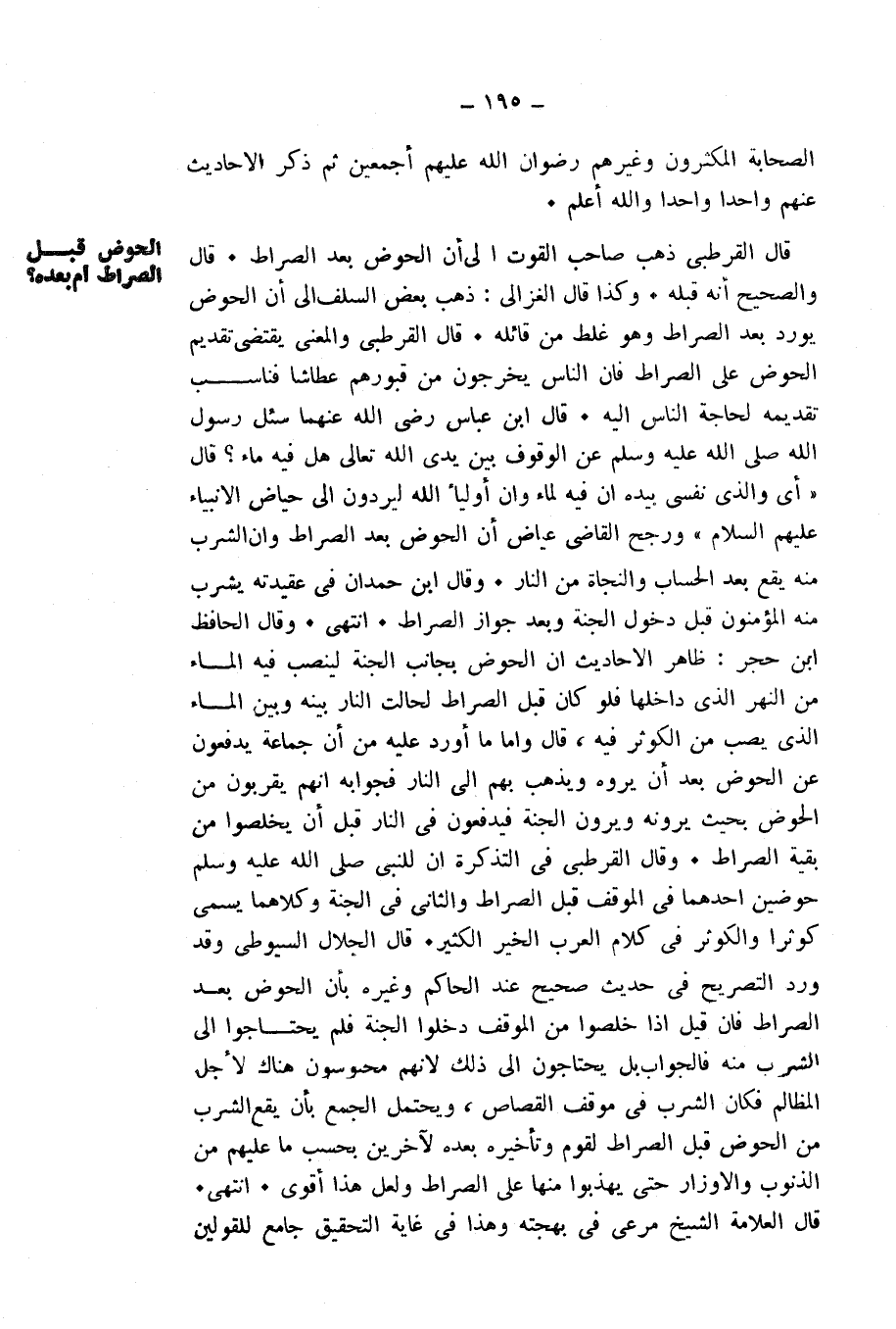قَالَ الْجَلَالُ السُّيُوطِيُّ: وَقَدْ وَرَدَ التَّصْرِيحُ فِي حَدِيثٍ صَحِيحٍ عِنْدَ الْحَاكِمِ، وَغَيْرِهِ بِأَنَّ الْحَوْضَ بَعْدَ الصِّرَاطِ، فَإِنْ قِيلَ: إِذَا خَلَصُوا مِنَ الْمَوْقِفِ دَخَلُوا الْجَنَّةَ، فَلَمْ يَحْتَاجُوا إِلَى الشُّرْبِ مِنْهُ، فَالْجَوَابُ: بَلْ يَحْتَاجُونَ إِلَى ذَلِكَ لِأَنَّهُمْ مَحْبُوسُونَ هُنَاكَ لِأَجْلِ الْمَظَالِمِ، فَكَانَ الشُّرْبُ فِي مَوْقِفِ الْقِصَاصِ، وَيُحْتَمَلُ الْجَمْعُ بِأَنْ يَقَعَ الشُّرْبُ مِنَ الْحَوْضِ قَبْلَ الصِّرَاطِ لِقَوْمٍ وَتَأْخِيرُهُ بَعْدَهُ لِآخَرِينَ بِحَسَبِ مَا عَلَيْهِمْ مِنَ الذُّنُوبِ وَالْأَوْزَارِ حَتَّى يُهَذَّبُوا مِنْهَا عَلَى الصِّرَاطِ، وَلَعَلَّ هَذَا أَقْوَى. انْتَهَى.