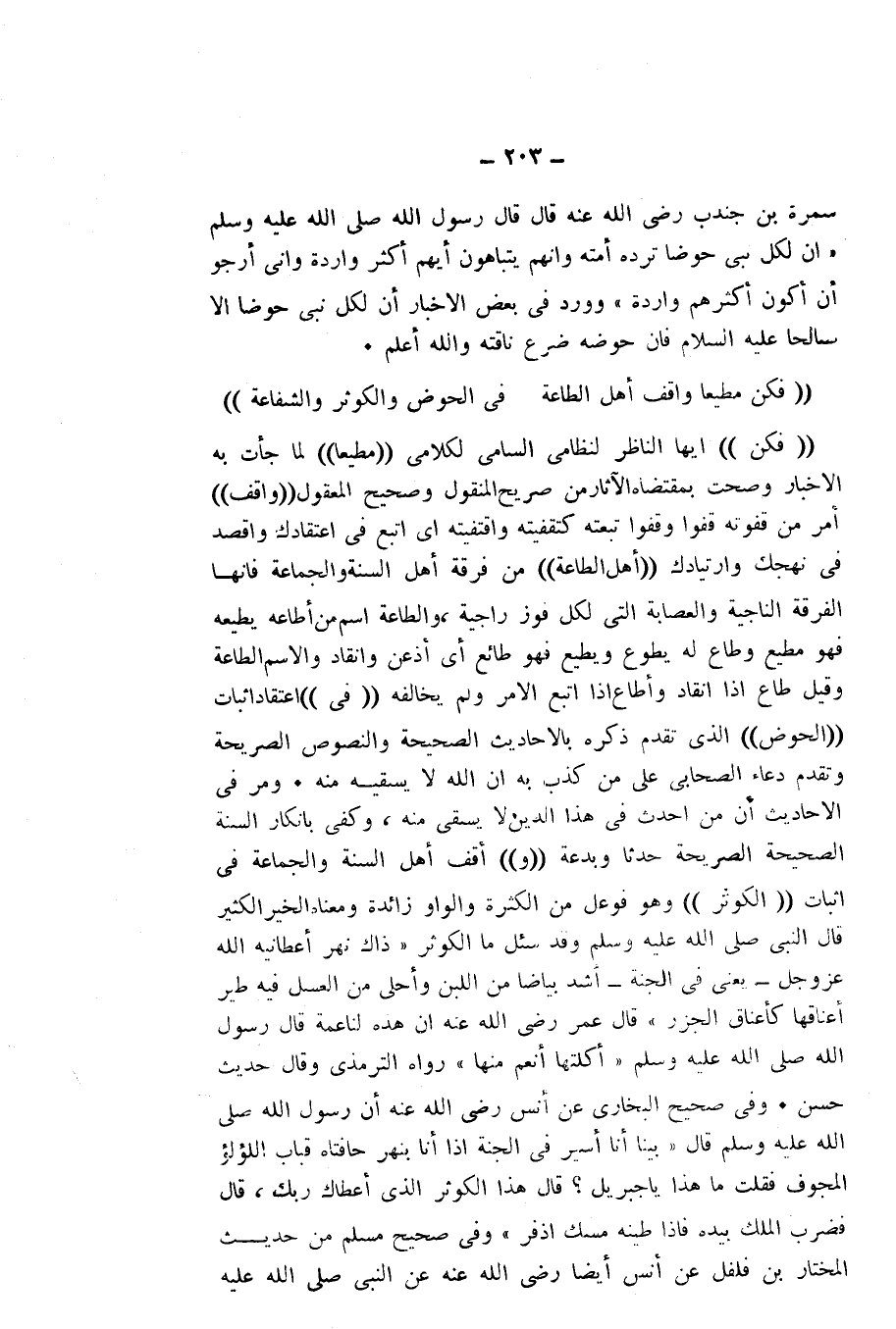 وَمَرَّ فِي الْأَحَادِيثِ: أَنَّ مَنْ أَحْدَثَ فِي هَذَا الدِّينِ لَا يُسْقَى مِنْهُ، وَكَفَى بِإِنْكَارِ السُّنَّةِ الصَّحِيحَةِ الصَّرِيحَةِ حَدَثًا وَبِدْعَةً ((وَ)) اقْفُ أَهْلَ السُّنَّةِ وَالْجَمَاعَةِ فِي إِثْبَاتِ ((الْكَوْثَرِ)) وَهُوَ فَوَعْلٌ مِنَ الْكَثْرَةِ، وَالْوَاوُ زَائِدَةٌ، وَمَعْنَاهُ الْخَيْرُ الْكَثِيرُ، قَالَ النَّبِيُّ - صَلَّى اللَّهُ عَلَيْهِ وَسَلَّمَ - وَقَدْ «سُئِلَ مَا الْكَوْثَرُ " ذَاكَ نَهْرٌ أَعْطَانِيهِ اللَّهُ - عَزَّ وَجَلَّ - يَعْنِي فِي الْجَنَّةِ، أَشَدُّ بَيَاضًا مِنَ اللَّبَنِ، وَأَحْلَى مِنَ الْعَسَلِ، فِيهِ طَيْرٌ أَعْنَاقُهَا كَأَعْنَاقِ الْجُزُرِ " قَالَ عُمَرُ: - رَضِيَ اللَّهُ عَنْهُ: إِنَّ هَذِهِ لَنَاعِمَةٌ، قَالَ رَسُولُ اللَّهِ - صَلَّى اللَّهُ عَلَيْهِ وَسَلَّمَ: " أَكَلَتُهَا أَنْعَمُ مِنْهَا» رَوَاهُ التِّرْمِذِيُّ، وَقَالَ: حَدِيثٌ حَسَنٌ.