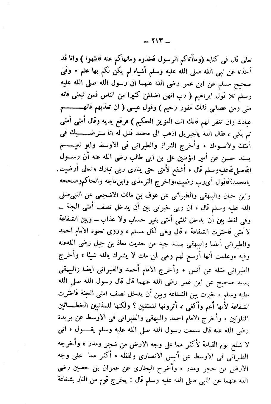 «إِنَّ رَبِّي خَيَّرَنِي بَيْنَ أَنْ يُدْخِلَ نِصْفَ أُمَّتِي الْجَنَّةَ - وَفِي لَفْظٍ: بَيْنَ أَنْ يُدْخِلَ ثُلُثَيْ أُمَّتِي - بِغَيْرِ حِسَابٍ وَلَا عَذَابٍ وَبَيْنَ الشَّفَاعَةِ لِأُمَّتِي، فَاخْتَرْتُ الشَّفَاعَةَ، قَالَ: وَهِيَ لِكُلِّ مُسْلِمٍ» ". وَرَوَى نَحْوَهُ الْإِمَامُ أَحْمَدُ، وَالطَّبَرَانِيُّ أَيْضًا، وَالْبَيْهَقِيُّ بِسَنَدٍ جَيِّدٍ مِنْ حَدِيثِ مُعَاذِ بْنِ جَبَلٍ - رَضِيَ اللَّهُ عَنْهُ - وَفِيهِ " «وَعَلِمْتُ أَنَّهَا أَوْسَعُ لَهُمْ، وَهِيَ لِمَنْ مَاتَ لَا يُشْرِكُ بِاللَّهِ شَيْئًا» ".