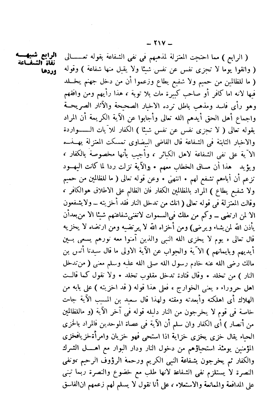 مِمَّا احْتَجَّتِ الْمُعْتَزِلَةُ لِمَذْهَبِهِمْ فِي نَفْيِ الشَّفَاعَةِ بِقَوْلِهِ تَعَالَى: {وَاتَّقُوا يَوْمًا لَا تَجْزِي نَفْسٌ عَنْ نَفْسٍ شَيْئًا وَلَا يُقْبَلُ مِنْهَا شَفَاعَةٌ} [البقرة: 48] وَقَوْلُهُ: {مَا لِلظَّالِمِينَ مِنْ حَمِيمٍ وَلَا شَفِيعٍ يُطَاعُ} [غافر: 18] ، وَزَعَمُوا أَنَّ مَنْ دَخَلَ جَهَنَّمَ يُخَلَّدُ فِيهَا لِأَنَّهُ إِمَّا كَافِرٌ أَوْ صَاحِبُ كَبِيرَةٍ مَاتَ بِلَا تَوْبَةٍ، هَذَا رَأْيُهُمْ وَمَنْ وَافَقَهُمْ، وَهُوَ رَأْيٌ فَاسِدٌ وَمَذْهَبٌ بَاطِلٌ تَرُدُّهُ الْأَخْبَارُ الصَّحِيحَةُ، وَالْآثَارُ الصَّرِيحَةُ، وَإِجْمَاعُ أَهْلِ الْحَقِّ أَيَّدَهُمُ اللَّهُ تَعَالَى، وَأَجَابُوا عَنِ الْآيَةِ الْكَرِيمَةِ أَنَّ الْمُرَادَ بِقَوْلِهِ تَعَالَى: {لَا تَجْزِي نَفْسٌ عَنْ نَفْسٍ شَيْئَا} [البقرة: 48] الْكُفَّارُ لِلْآيَاتِ الْوَارِدَةِ، وَالْأَخْبَارِ الثَّابِتَةِ فِي الشَّفَاعَةِ، قَالَ الْقَاضِي الْبَيْضَاوِيُّ: تَمَسَّكَتِ الْمُعْتَزِلَةُ بِهَذِهِ الْآيَةِ عَلَى نَفْيِ الشَّفَاعَةِ لِأَهْلِ الْكَبَائِرِ، وَأُجِيبَ بِأَنَّهَا مَخْصُوصَةٌ لِلْكُفَّارِ، وَيُؤَيِّدُ هَذَا أَنَّ مِيثَاقَ الْخِطَابِ مَعَهُمْ.