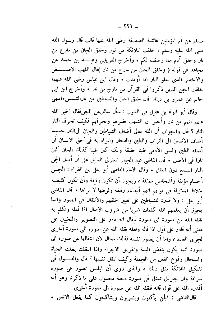 وَقَالَ الْإِمَامُ الْقَاضِي أَبُو يَعْلَى بْنُ الْفَرَّاءِ: الْجِنُّ أَجْسَامٌ مُؤَلَّفَةٌ، وَأَشْخَاصٌ مُمَثَّلَةٌ، وَيَجُوزُ أَنْ تَكُونَ رَقِيقَةً وَأَنْ تَكُونَ كَثِيفَةً، خِلَافًا لِلْمُعْتَزِلَةِ فِي قَوْلِهِمْ: إِنَّهُمْ أَجْسَامٌ رَقِيقَةٌ، وَلِرِقَّتِهَا لَا تَرَاهَا. قَالَ الْقَاضِي أَبُو يَعْلَى: وَلَا قُدْرَةَ لِلشَّيَاطِينِ عَلَى تَغْيِيرِ خَلْقِهِمْ وَالِانْتِقَالِ فِي الصُّوَرِ، وَإِنَّمَا يَجُوزُ أَنْ يُعَلِّمَهُمُ اللَّهُ كَلِمَاتٍ ضَرْبًا مِنْ ضُرُوبِ الْأَفْعَالِ إِذَا فَعَلَهَا وَتَكَلَّمَ بِهَا نَقَلَهُ اللَّهُ مِنْ صُورَةٍ إِلَى صُورَةٍ، فَيُقَالُ إِنَّهُ قَادِرٌ عَلَى التَّصْوِيرِ وَالتَّخْيِيلِ عَلَى مَعْنَى أَنَّهُ قَادِرٌ عَلَى قَوْلٍ إِذَا قَالَهُ وَفَعَلَهُ نَقَلَهُ اللَّهُ عَنْ صُورَةٍ إِلَى أُخْرَى لِجَرْيِ الْعَادَةِ، وَأَمَّا أَنْ يُصَوِّرَ نَفْسَهُ فِي ذَلِكَ فَذَلِكَ مُحَالٌ؛ لِأَنَّ انْتِقَالَهَا عَنْ صُورَةٍ إِلَى صُورَةٍ إِنَّمَا يَكُونُ بِنَقْضِ الْبِنْيَةِ وَتَفْرِيقِ الْأَجْزَاءِ، وَإِذَا انْتَقَلَتْ بَطُلَتِ الْحَيَاةُ وَاسْتَحَالَ وُقُوعُ الْفِعْلِ مِنَ الْجُمْلَةِ، وَكَيْفَ تَنْقُلُ نَفْسَهَا؟ قَالَ: وَالْقَوْلُ فِي تَشْكِيلِ الْمَلَائِكَةِ مِثْلُ ذَلِكَ، وَالَّذِي رُوِيَ أَنَّ إِبْلِيسَ تَصَوَّرَ فِي صُورَةِ سُرَاقَةَ، وَأَنَّ جِبْرِيلَ تَمَثَّلَ فِي صُورَةِ دِحْيَةَ مَحْمُولٌ عَلَى مَا ذَكَرْنَا، وَهُوَ أَنَّهُ أَقْدَرَهُ اللَّهُ عَلَى قَوْلٍ قَالَهُ فَنَقَلَهُ اللَّهُ عَنْ صُورَةٍ إِلَى صُورَةٍ أُخْرَى، قَالَ الْقَاضِي: الْجِنُّ يَأْكُلُونَ وَيَشْرَبُونَ وَيَتَنَاكَحُونَ كَمَا يَفْعَلُ الْإِنْسُ.