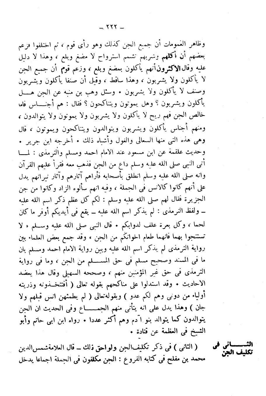 فِي ذِكْرِ تَكْلِيفِ الْجِنِّ، وَلَوَاحِقِ ذَلِكَ - قَالَ الْعَلَّامَةُ شَمْسُ الدِّينِ مُحَمَّدُ بْنُ مُفْلِحٍ فِي كِتَابِهِ الْفُرُوعِ: الْجِنُّ مُكَلَّفُونَ فِي الْجُمْلَةِ إِجْمَاعًا يَدْخُلُ