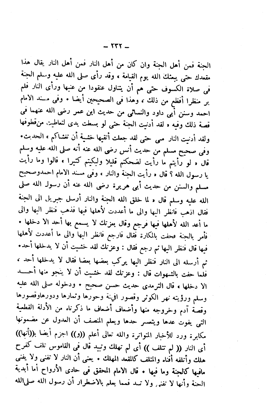 وَدُخُولُهُ - صَلَّى اللَّهُ عَلَيْهِ وَسَلَّمَ - وَرُؤْيَتُهُ نَهْرَ الْكَوْثَرِ وَقُصُورًا فِي الْجَنَّةِ وَحُورَهَا وَثِمَارَهَا وَدُورَهَا وَقُصُورَهَا، وَقِصَّةُ آدَمَ وَخُرُوجُهُ مِنْهَا، وَأَضْعَافُ أَضْعَافِ مَا ذَكَرْنَاهُ مِنَ الْأَدِلَّةِ الْقَطْعِيَّةِ الَّتِي يَفُوتُ عَدُّهَا، وَيَتَعَسَّرُ حَدُّهَا، وَيَعْلَمُ الْمُنْصِفُ أَنَّ الْعُدُولَ عَنْ مَضْمُونِهَا مُكَابَرَةٌ، وَرَدٌّ لِلْأَخْبَارِ الْمُتَوَاتِرَةِ، وَاللَّهُ تَعَالَى أَعْلَمُ.