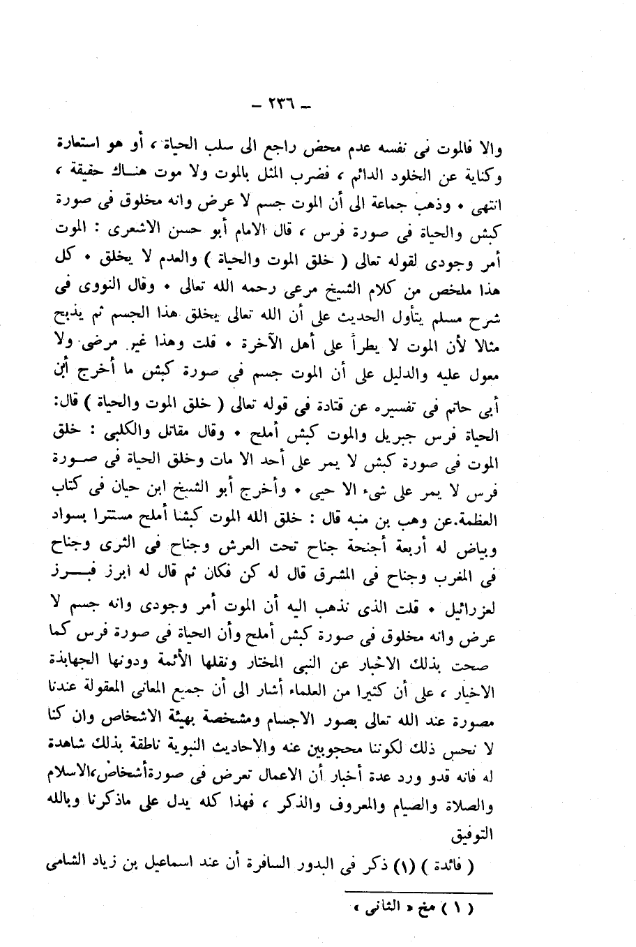 قُلْتُ: الَّذِي نَذْهَبُ إِلَيْهِ أَنَّ الْمَوْتَ أَمْرٌ وُجُودِيٌّ، وَأَنَّهُ جِسْمٌ لَا عَرَضٌ، وَأَنَّهُ مَخْلُوقٌ فِي صُورَةِ كَبْشٍ أَمْلَحَ، وَأَنَّ الْحَيَاةَ فِي صُورَةِ فَرَسٍ كَمَا صَحَّتْ بِذَلِكَ الْأَخْبَارُ عَنِ النَّبِيِّ الْمُخْتَارِ، وَنَقَلَهُ الْأَئِمَّةُ وَدَوَّنَهُ الْجَهَابِذَةُ الْأَخْيَارُ، عَلَى أَنَّ كَثِيرًا مِنَ الْعُلَمَاءِ أَشَارَ إِلَى أَنَّ جَمِيعَ الْمَعَانِي الْمَعْقُولَةِ عِنْدَنَا مُصَوَّرَةٌ عِنْدَ اللَّهِ تَعَالَى بِصُوَرِ الْأَجْسَامِ، وَمُشَخَّصَةٌ بِهَيْئَةِ الْأَشْخَاصِ، وَإِنْ كُنَّا لَا نُحِسُّ ذَلِكَ لِكَوْنِنَا مَحْجُوبِينَ عَنْهُ، وَالْأَحَادِيثُ النَّبَوِيَّةُ نَاطِقَةٌ بِذَلِكَ شَاهِدَةٌ لَهُ، فَإِنَّهُ قَدْ وَرَدَ عِدَّةُ أَخْبَارٍ أَنَّ الْأَعْمَالَ تُعْرَضُ فِي صُورَةِ أَشْخَاصٍ، الْإِسْلَامُ وَالصَّلَاةُ وَالصِّيَامُ وَالْمَعْرُوفُ وَالذِّكْرُ، فَهَذَا كُلُّهُ يَدُلُّ عَلَى مَا ذَكَرْنَاهُ، وَبِاللَّهِ التَّوْفِيقُ.
