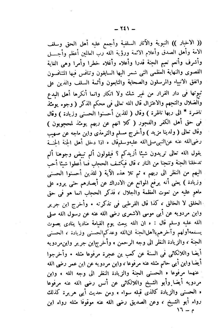 ((الْأَخْبَارِ)) النَّبَوِيَّةِ، وَالْآثَارِ السَّلَفِيَّةِ، وَأَجْمَعَ عَلَيْهِ أَهْلُ الْحَقِّ وَسَلَفُ الْأُمَّةِ وَأَهْلُ الصِّدْقِ وَأَعْلَامُ الْأَئِمَّةِ، وَرُؤْيَةُ اللَّهِ رَبِّ الْعَالَمِينَ أَعْظَمُ وَأَجَلُّ وَأَشْرَفُ، وَأَنْعَمُ نَعِيمِ الْجَنَّةِ قَدْرًا، وَأَعْلَاهُ وَأَغْلَاهُ خَطَرًا وَأَمْرًا، وَهِيَ الْغَايَةُ الْقُصْوَى وَالنِّهَايَةُ الْعُظْمَى الَّتِي شَمَّرَ إِلَيْهَا السَّابِقُونَ، وَتَنَافَسَ فِيهَا الْمُتَنَافِسُونَ، وَاتَّفَقَ الْأَنْبِيَاءُ وَالْمُرْسَلُونَ، وَالصَّحَابَةُ وَالتَّابِعُونَ، وَأَئِمَّةُ السَّلَفِ وَالدِّينِ عَلَى ثُبُوتِهَا فِي دَارِ الْقَرَارِ، مِنْ غَيْرِ شَكٍّ وَلَا إِنْكَارٍ، وَإِنَّمَا أَنْكَرَهَا أَهْلُ الْبِدَعِ وَالضَّلَالِ، وَالتَّجَهُّمِ وَالِاعْتِزَالِ، قَالَ اللَّهُ تَعَالَى فِي مُحْكَمِ الذِّكْرِ: {وُجُوهٌ يَوْمَئِذٍ نَاضِرَةٌ - إِلَى رَبِّهَا نَاظِرَةٌ} [القيامة: 22 - 23] وَقَالَ {لِلَّذِينَ أَحْسَنُوا الْحُسْنَى وَزِيَادَةٌ} [يونس: 26] ، وَقَالَ فِي حَقِّ أَهْلِ الْكُفْرِ وَالْفُجُورِ {كَلَّا إِنَّهُمْ عَنْ رَبِّهِمْ يَوْمَئِذٍ لَمَحْجُوبُونَ} [المطففين: 15] وَقَالَ تَعَالَى {وَلَدَيْنَا مَزِيدٌ} [ق: 35] وَأَخْرَجَ مُسْلِمٌ وَالتِّرْمِذِيُّ، وَابْنُ مَاجَهْ عَنْ صُهَيْبٍ - رَضِيَ اللَّهُ عَنْهُ - عَنِ النَّبِيِّ - صَلَّى اللَّهُ عَلَيْهِ وَسَلَّمَ - قَالَ: " «إِذَا دَخَلَ أَهْلُ الْجَنَّةِ الْجَنَّةَ يَقُولُ اللَّهُ تَعَالَى: تُرِيدُونَ شَيْئًا أَزِيدُكُمْ؟ فَيَقُولُونَ: أَلَمْ تُبَيِّضْ وُجُوهَنَا! أَلَمْ تُدْخِلْنَا الْجَنَّةَ وَتُنَجِّنَا مِنَ النَّارِ! ، قَالَ: فَيُكْشَفُ الْحِجَابُ، فَمَا أُعْطُوا شَيْئًا أَحَبَّ إِلَيْهِمْ مِنَ النَّظَرِ إِلَى رَبِّهِمْ» " ثُمَّ تَلَى هَذِهِ الْآيَةَ {لِلَّذِينَ أَحْسَنُوا الْحُسْنَى وَزِيَادَةٌ} [يونس: 26] يَعْنِي أَنَّهُ يَرْفَعُ الْمَوَانِعَ عَنِ الْإِدْرَاكِ عَنْ أَبْصَارِهِمْ حَتَّى يَرَوْهُ عَلَى مَا هُوَ عَلَيْهِ مِنْ نُعُوتِ الْعَظَمَةِ وَالْجَلَالِ، فَذِكْرُ الْحِجَابِ إِنَّمَا هُوَ فِي حَقِّ الْخَلْقِ لَا الْخَالِقِ، كَذَا قَالَ الْقُرْطُبِيُّ: فِي تَذْكِرَتِهِ.