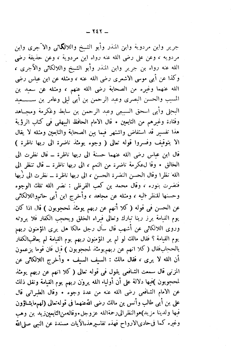 قَالَ الْإِمَامُ الْحَافِظُ الْبَيْهَقِيُّ فِي كِتَابِهِ الرُّؤْيَةِ: هَذَا تَفْسِيرٌ قَدِ اسْتَفَاضَ، وَاشْتَهَرَ فِيمَا بَيْنُ الصَّحَابَةِ وَالتَّابِعِينَ، وَمِثْلُهُ لَا يُقَالُ إِلَّا بِتَوْقِيفٍ، وَفَسَّرُوا قَوْلَهُ تَعَالَى {وُجُوهٌ يَوْمَئِذٍ نَاضِرَةٌ - إِلَى رَبِّهَا نَاظِرَةٌ} [القيامة: 22 - 23] قَالَ ابْنُ عَبَّاسٍ - رَضِيَ اللَّهُ عَنْهُمَا - حَسَنَةٌ إِلَى رَبِّهَا نَاظِرَةٌ - قَالَ: نَظَرَتْ إِلَى الْخَالِقِ. وَقَالَ عِكْرِمَةُ: نَاضِرَةٌ مِنَ النِّعَمِ، إِلَى رَبِّهَا نَاظِرَةٌ - قَالَ: تَنْظُرُ إِلَى اللَّهِ نَظَرًا، وَقَالَ الْحَسَنُ: النُّضْرَةُ الْحُسْنُ - إِلَى رَبِّهَا نَاظِرَةٌ - نَظَرَتْ إِلَى رَبِّهَا فَنَضَرَتْ بِنُورِهِ، وَقَالَ مُحَمَّدُ بْنُ كَعْبٍ الْكُرْزِيُّ: نَضَّرَ اللَّهُ تِلْكَ الْوُجُوهَ وَحَسَّنَهَا لِلنَّظَرِ إِلَيْهَا، وَمِثْلُهُ عَنْ مُجَاهِدٍ، وَأَخْرَجَ ابْنُ أَبِي حَاتِمٍ وَاللَّالْكَائِيُّ عَنِ الْحَسَنِ فِي قَوْلِهِ {كَلَّا إِنَّهُمْ عَنْ رَبِّهِمْ يَوْمَئِذٍ لَمَحْجُوبُونَ} [المطففين: 15] قَالَ: إِذَا كَانَ يَوْمُ الْقِيَامَةِ بَرَزَ رَبُّنَا تَبَارَكَ وَتَعَالَى فَيَرَاهُ الْخَلْقُ، وَيُحْجَبُ الْكُفَّارُ فَلَا يَرَوْنَهُ، وَرَوَى اللَّالْكَائِيُّ عَنْ أَشْهَبَ قَالَ: سَأَلَ رَجُلٌ مَالِكًا هَلْ يَرَى الْمُؤْمِنُونَ رَبَّهُمْ يَوْمَ الْقِيَامَةِ؟ فَقَالَ مَالِكٌ: لَوْ لَمْ يَرَى الْمُؤْمِنُونَ رَبَّهُمْ يَوْمَ الْقِيَامَةِ لَمْ يُعَاقِبِ الْكُفَّارَ بِالْحِجَابِ، فَقَالَ: {كَلَّا إِنَّهُمْ عَنْ رَبِّهِمْ يَوْمَئِذٍ لَمَحْجُوبُونَ} [المطففين: 15] قِيلَ: فَإِنَّ قَوْمًا يَزْعُمُونَ أَنَّ اللَّهَ لَا يُرَى، فَقَالَ مَالِكٌ: السَّيْفَ السَّيْفَ. وَأَخْرَجَ اللَّالْكَائِيُّ عَنِ الْمُزَنِيِّ قَالَ: سَمِعْتُ الشَّافِعِيَّ يَقُولُ فِي قَوْلِهِ تَعَالَى {كَلَّا إِنَّهُمْ عَنْ رَبِّهِمْ يَوْمَئِذٍ لَمَحْجُوبُونَ} [المطففين: 15] : فِيهَا دَلَالَةٌ عَلَى أَنَّ أَوْلِيَاءَ اللَّهِ يَرَوْنَ رَبَّهُمْ يَوْمَ الْقِيَامَةِ، وَنَقَلَ ذَلِكَ عَنِ الْإِمَامِ الشَّافِعِيِّ - رَضِيَ اللَّهُ عَنْهُ - مِنْ عِدَّةِ وُجُوهٍ.