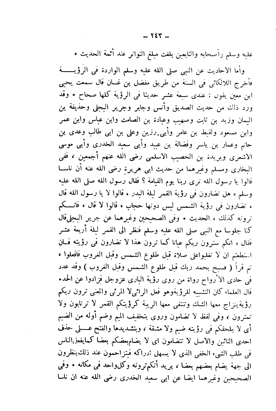 عَلَيْهِ وَسَلَّمَ وَأَصْحَابِهِ وَالتَّابِعِينَ بَلَغَتْ مَبْلَغَ التَّوَاتُرِ عِنْدَ أَئِمَّةِ الْحَدِيثِ. وَأَمَّا الْأَحَادِيثُ عَنِ النَّبِيِّ - صَلَّى اللَّهُ عَلَيْهِ وَسَلَّمَ - الْوَارِدَةُ فِي الرُّؤْيَةِ فَأَخْرَجَ اللَّالْكَائِيُّ فِي السُّنَّةِ مِنْ طَرِيقِ مُفَضَّلِ بْنِ غَسَّانَ قَالَ: سَمِعْتُ يَحْيَى بْنَ مَعِينٍ يَقُولُ: عِنْدِي سَبْعَةَ عَشَرَ حَدِيثًا فِي الرُّؤْيَةِ كُلُّهَا صِحَاحٌ.