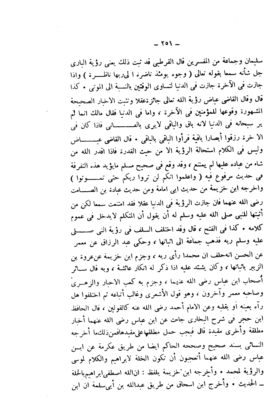كَذَا قَالَ، وَقَالَ الْقَاضِي عِيَاضٌ: رُؤْيَةُ اللَّهِ تَعَالَى جَائِزَةٌ عَقْلًا، وَتُثْبِتُ الْأَخْبَارُ الصَّحِيحَةُ الْمَشْهُورَةُ وُقُوعَهَا لِلْمُؤْمِنِينَ فِي الْآخِرَةِ، وَأَمَّا فِي الدُّنْيَا فَقَالَ مَالِكٌ: إِنَّمَا لَمْ يُرَ سُبْحَانَهُ فِي الدُّنْيَا لِأَنَّهُ بَاقٍ، وَالْبَاقِي لَا يُرَى بِالْفَانِي، فَإِذَا كَانَ فِي الْآخِرَةِ رُزِقُوا أَبْصَارًا بَاقِيَةً فَرَأَوُا الْبَاقِيَ بِالْبَاقِي.