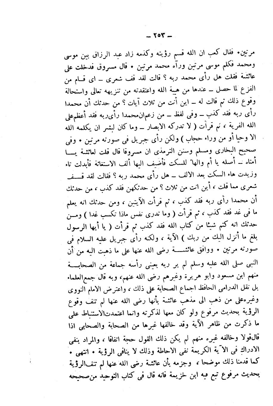 قَالَ مَسْرُوقٌ: «فَدَخَلْتُ عَلَى عَائِشَةَ فَقُلْتُ: هَلْ رَأَى مُحَمَّدٌ رَبَّهُ؟ قَالَتْ: لَقَدْ قَفَّ شَعْرِي - أَيْ قَامَ مِنَ الْفَزَعِ لِمَا حَصَلَ - عِنْدَهَا مِنْ هَيْبَةِ اللَّهِ وَاعْتَقَدْتُهُ مِنْ تَنْزِيهِهِ تَعَالَى وَاسْتِحَالَةِ وُقُوعِ ذَلِكَ، ثُمَّ قَالَتْ لَهُ: - أَيْنَ أَنْتَ مِنْ ثَلَاثِ آيَاتٍ؟ مَنْ حَدَّثَكَ أَنَّ مُحَمَّدًا رَأَى رَبَّهُ فَقَدْ كَذَبَ، وَفِي لَفْظٍ: مَنْ زَعَمَ أَنَّ مُحَمَّدًا رَأَى رَبَّهُ فَقَدْ أَعْظَمَ عَلَى اللَّهِ الْفِرْيَةَ، ثُمَّ قَرَأَتْ {لَا تُدْرِكُهُ الْأَبْصَارُ} [الأنعام: 103]- {وَمَا كَانَ لِبَشَرٍ أَنْ يُكَلِّمَهُ اللَّهُ إِلَّا وَحْيًا أَوْ مِنْ وَرَاءِ حِجَابٍ} [الشورى: 51] وَلَكِنْ رَأَى جِبْرِيلَ فِي صُورَتِهِ مَرَّتَيْنِ» .
