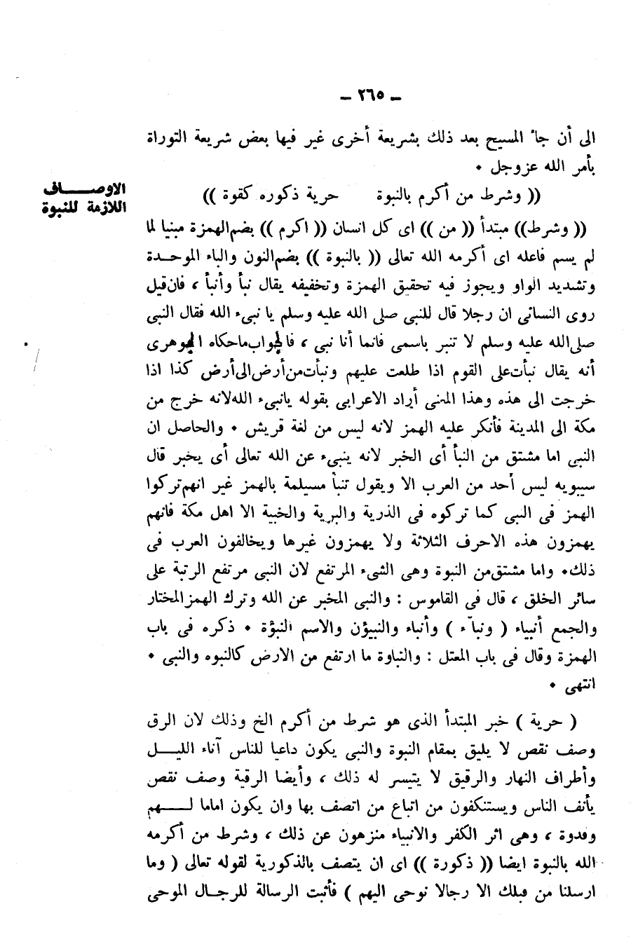 ((وَشَرْطُ)) مُبْتَدَأٌ " مَنْ " أَيْ: كُلُّ إِنْسَانٍ " أُكْرِمَ " بِضَمِّ الْهَمْزَةِ مَبْنِيًّا لِمَا لَمْ يُسَمَّ فَاعِلُهُ، أَيْ: أَكْرَمَهُ اللَّهَ تَعَالَى " بِالنُّبُوَّةِ " بِضَمِّ النُّونِ وَالْبَاءِ الْمُوَحَّدَةِ، وَتَشْدِيدِ الْوَاوِ، وَيَجُوزُ فِيهِ تَحْقِيقُ الْهَمْزَةِ وَتَخْفِيفُهُ، يُقَالُ: نَبَّأَ وَأَنْبَأَ، فَإِنْ قِيلَ: رَوَى النَّسَائِيُّ «أَنَّ رَجُلًا قَالَ لِلنَّبِيِّ - صَلَّى اللَّهُ عَلَيْهِ وَسَلَّمَ - يَا نَبِيءَ اللَّهِ، فَقَالَ النَّبِيُّ - صَلَّى اللَّهُ عَلَيْهِ وَسَلَّمَ: " لَا تَنْبُرْ بِاسْمِي فَإِنَّمَا أَنَا نَبِيٌّ» "، فَالْجَوَابُ مَا حَكَاهُ الْجَوْهَرِيُّ أَنَّهُ يُقَالُ: نَبَأْتُ عَلَى الْقَوْمِ إِذَا طَلَعْتَ عَلَيْهِمْ، وَنَبَأْتُ مِنْ أَرْضٍ إِلَى أَرْضِ كَذَا إِذَا خَرَجْتَ إِلَى هَذِهِ، وَهَذَا الْمَعْنَى أَرَادَ الْأَعْرَابِيُّ بِقَوْلِهِ: يَا نَبِيءَ اللَّهِ؛ لِأَنَّهُ خَرَجَ مِنْ مَكَّةَ إِلَى الْمَدِينَةِ، فَأَنْكَرَ عَلَيْهِ الْهَمْزَ لِأَنَّهُ لَيْسَ مِنْ لُغَةِ قُرَيْشٍ. وَالْحَاصِلُ: أَنَّ النَّبِيَّ إِمَّا مُشْتَقٌّ مِنَ النَّبَإِ أَيِ الْخَبَرِ؛ لِأَنَّهُ يُنْبِئُ عَنِ اللَّهِ تَعَالَى، أَيْ: يُخْبِرُ، قَالَ سِيبَوَيْهِ: لَيْسَ أَحَدٌ مِنَ الْعَرَبِ إِلَّا وَيَقُولُ: تَنَبَّأَ مُسَيْلِمَةُ بِالْهَمْزِ، غَيْرَ أَنَّهُمْ تَرَكُوا الْهَمْزَ فِي النَّبِيِّ كَمَا تَرَكُوهُ فِي الذُّرِّيَّةِ وَالْبَرِيَّةِ وَالْخَبِيَّةِ، إِلَّا أَهْلَ مَكَّةَ فَإِنَّهُمْ يَهْمِزُونَ هَذِهِ الْأَحْرُفَ الثَّلَاثَةَ، وَلَا يَهْمِزُونَ غَيْرَهَا وَيُخَالِفُونَ الْعَرَبَ فِي ذَلِكَ.