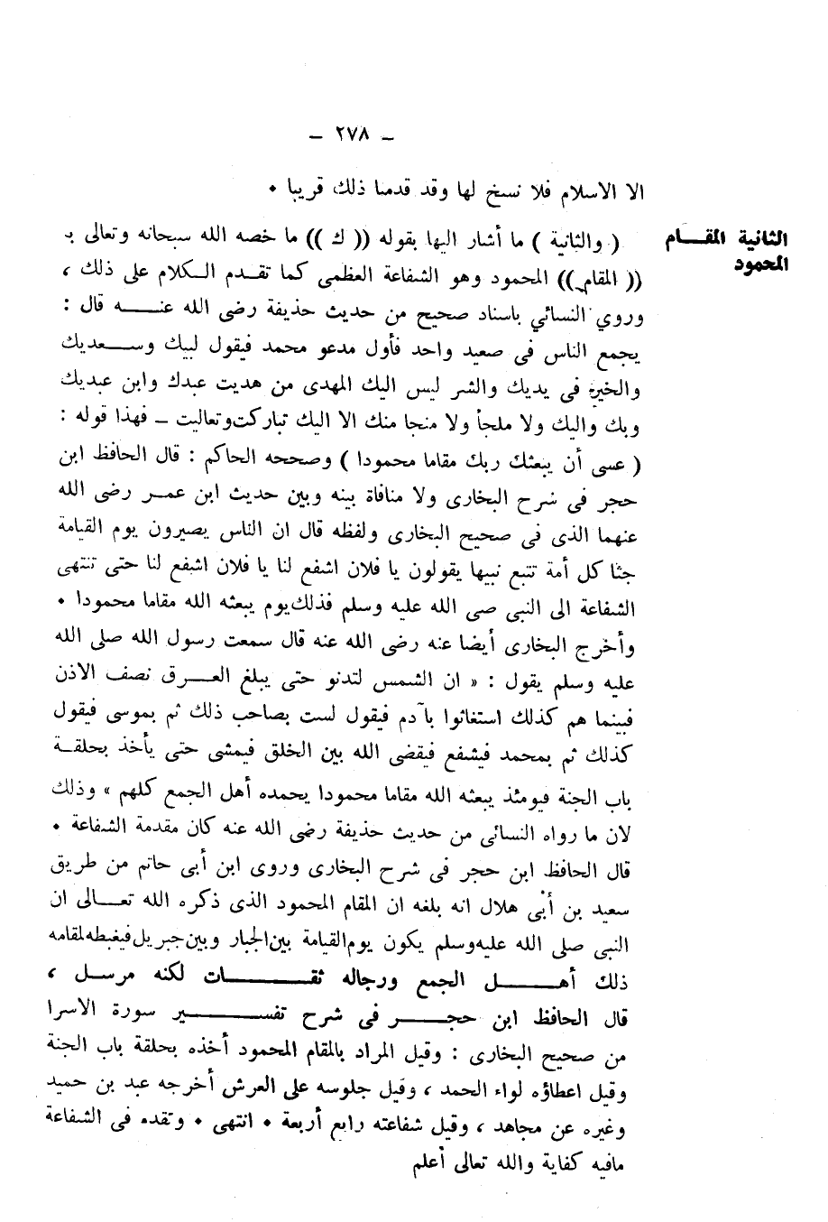 إِلَّا الْإِسْلَامَ فَلَا نَسْخَ لَهَا، وَقَدْ قَدَّمْنَا ذَلِكَ قَرِيبًا. (وَالثَّانِيَةُ) : مَا أَشَارَ إِلَيْهَا بِقَوْلِهِ ((كَـ)) مَا خَصَّهُ اللَّهُ سُبْحَانَهُ وَتَعَالَى بِـ ((الْمَقَامِ)) الْمَحْمُودِ، وَهُوَ الشَّفَاعَةُ الْعُظْمَى كَمَا تَقَدَّمَ الْكَلَامُ عَلَى ذَلِكَ، وَرَوَى النَّسَائِيُّ بِإِسْنَادٍ صَحِيحٍ مِنْ حَدِيثِ حُذَيْفَةَ - رَضِيَ اللَّهُ عَنْهُ - قَالَ: «يُجْمَعُ النَّاسُ فِي صَعِيدٍ وَاحِدٍ، فَأَوَّلُ مَدْعُوٍّ مُحَمَّدٌ، فَيَقُولُ: لَبَّيْكَ وَسَعْدَيْكَ، وَالْخَيْرُ فِي يَدَيْكَ، وَالشَّرُّ لَيْسَ إِلَيْكَ، الْمَهْدِيُّ مَنْ هَدَيْتَ، عَبْدُكَ وَابْنُ عَبْدَيْكَ، وَبِكَ وَإِلَيْكَ، وَلَا مَلْجَأَ وَلَا مَنْجَا مِنْكَ إِلَّا إِلَيْكَ، تَبَارَكْتَ وَتَعَالَيْتَ - فَهَذَا قَوْلُهُ: {عَسَى أَنْ يَبْعَثَكَ رَبُّكَ مَقَامًا مَحْمُودًا} [الإسراء: 79] » ) وَصَحَّحَهُ الْحَاكِمُ: قَالَ الْحَافِظُ ابْنُ حَجَرٍ فِي شَرْحِ الْبُخَارِيِّ، وَلَا مُنَافَاةَ بَيْنَهُ وَبَيْنَ حَدِيثِ ابْنِ عُمَرَ - رَضِيَ اللَّهُ عَنْهُمَا - الَّذِي فِي صَحِيحِ الْبُخَارِيِّ، وَلَفْظُهُ قَالَ: «إِنَّ النَّاسَ يَصِيرُونَ يَوْمَ الْقِيَامَةِ جُثًا، كُلُّ أُمَّةٍ تَتْبَعُ نَبِيَّهَا يَقُولُونَ: يَا فُلَانُ اشْفَعْ لَنَا، يَا فُلَانُ اشْفَعْ لَنَا، حَتَّى تَنْتَهِيَ الشَّفَاعَةُ إِلَى النَّبِيِّ - صَلَّى اللَّهُ عَلَيْهِ وَسَلَّمَ - فَذَلِكَ يَوْمَ يَبْعَثُهُ اللَّهُ مَقَامًا مَحْمُودًا» .