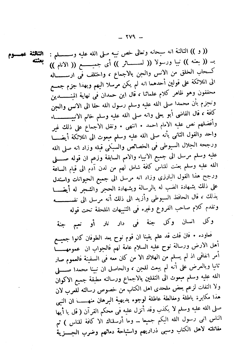 فَإِنْ قُلْتَ: قَدْ عُلِمَ يَقِينًا أَنَّ قَوْمَ نُوحٍ بَعْدَ الطُّوفَانِ كَانُوا جَمِيعَ أَهْلِ الْأَرْضِ، وَرِسَالَةُ نُوحٍ عَلَيْهِ السَّلَامُ عَامَّةٌ لَهُمْ، فَالْجَوَابُ: أَنَّ عُمُومَهَا أَمْرٌ اتِّفَاقِيٌّ إِذْ لَمْ يَسْلَمْ مِنَ الْهَلَاكِ إِلَّا مَنْ كَانَ مَعَهُ فِي السَّفِينَةِ، فَالْعُمُومُ صَارَ ثَانِيًا، وَبِالْعَرْضِ عَلَى أَنَّهُ لَمْ يُبْعَثْ لِلْجِنِّ، وَالْحَاصِلُ أَنَّ نَبِيَّنَا مُحَمَّدًا - صَلَّى اللَّهُ عَلَيْهِ وَسَلَّمَ - مَبْعُوثٌ إِلَى الثَّقَلَيْنِ بِالْإِجْمَاعِ، وَرِسَالَتُهُ مُطْبِقَةٌ جَمِيعَ الْأَكْوَانِ، وَلَا الْتِفَاتَ لِزَعْمِ بَعْضِ مُلْحِدِي أَهْلِ الْكِتَابِ مِنْ خُصُوصِ رِسَالَتِهِ لِلْعَرَبِ، لِأَنَّ هَذَا مُكَابَرَةٌ بَاطِلَةٌ، وَمُغَالَطَةٌ عَاطِلَةٌ لِوُجُوهٍ بَدِيهِيَّةِ الْبُرْهَانِ، مِنْهَا أَنَّ النَّبِيَّ - صَلَّى اللَّهُ عَلَيْهِ وَسَلَّمَ - لَا يَكْذِبُ، وَقَدْ أُنْزِلَ عَلَيْهِ فِي مُحْكَمِ الْقُرْآنِ {قُلْ يَا أَيُّهَا النَّاسُ إِنِّي رَسُولُ اللَّهِ إِلَيْكُمْ جَمِيعًا} [الأعراف: 158] {وَمَا أَرْسَلْنَاكَ إِلَّا كَافَّةً لِلنَّاسِ} [سبأ: 28] ثُمَّ مُقَاتَلَتُهُ لِأَهْلِ الْكِتَابِ وَسَبْيُ زَرَارِيِّهِمْ وَاسْتِبَاحَةُ دِمَائِهِمْ، وَضَرْبُ الْجِزْيَةِ