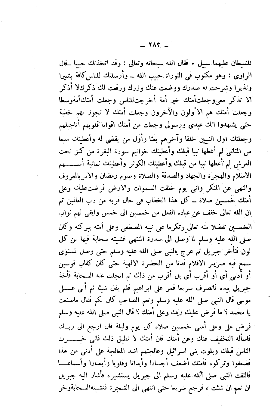 لِلشَّيَاطِينِ عَلَيْهِمَا سَبِيلٌ. فَقَالَ اللَّهُ سُبْحَانَهُ وَتَعَالَى: وَقَدِ اتَّخَذْتُكَ حَبِيبًا - قَالَ الرَّاوِي: وَهُوَ مَكْتُوبٌ فِي التَّوْرَاةِ حَبِيبُ اللَّهِ - وَأَرْسَلْتُكَ لِلنَّاسِ كَافَّةً بَشِيرًا وَنَذِيرًا، وَشَرَحْتُ لَكَ صَدْرَكَ، وَوَضَعْتُ عَنْكَ وِزْرَكَ، وَرَفَعْتُ لَكَ ذِكْرَكَ، لَا أُذْكَرُ إِلَّا تُذْكَرُ مَعِي، وَجَعَلْتُ أُمَّتَكَ خَيْرَ أُمَّةٍ أُخْرِجَتْ لِلنَّاسِ، وَجَعَلْتُ أُمَّتَكَ أَمَةً وَسَطًا، وَجَعَلْتُ أَمَّتَكَ هُمُ الْأَوَّلُونَ وَالْآخِرُونَ، وَجَعَلْتُ أُمَّتَكَ لَا تَجُوزُ لَهُمْ خُطْبَةٌ حَتَّى يَشْهَدُوا أَنَّكَ عَبْدِي وَرَسُولِي، وَجَعَلْتُ مِنْ أُمَّتِكَ أَقْوَامًا قُلُوبُهُمْ أَنَاجِيلُهُمْ، وَجَعَلْتُكَ أَوَّلَ النَّبِيِّينَ خَلْقًا وَآخِرَهُمْ بَعْثًا، وَأَوَّلَ مَنْ يُقْضَى لَهُ، وَأَعْطَيْتُكَ سَبْعًا مِنَ الْمَثَانِي لَمْ أُعْطِهَا نَبِيًّا قَبْلَكَ، وَأَعْطَيْتُكَ خَوَاتِيمَ سُورَةِ الْبَقَرَةِ مِنْ كَنْزٍ تَحْتَ الْعَرْشِ لَمْ أُعْطِهَا نَبِيًّا مِنْ قَبْلِكَ، وَأَعْطَيْتُكَ الْكَوْثَرَ، وَأَعْطَيْتُكَ ثَمَانِيَةَ أَسْهُمٍ: الْإِسْلَامُ وَالْهِجْرَةُ، وَالْجِهَادُ وَالصَّدَقَةُ، وَالصَّلَاةُ وَصَوْمُ رَمَضَانَ، وَالْأَمْرُ بِالْمَعْرُوفِ وَالنَّهْيُ عَنِ الْمُنْكَرِ، وَإِنِّي يَوْمَ خَلَقْتُ السَّمَاوَاتِ وَالْأَرْضَ فَرَضْتُ عَلَيْكَ وَعَلَى أُمَّتِكَ خَمْسِينَ صَلَاةً - كُلُّ هَذَا الْخِطَابِ فِي حَالِ قُرْبِهِ مِنْ رَبِّ الْعَالِمَيْنِ - ثُمَّ إِنَّ اللَّهَ تَعَالَى خَفَّفَ عَنْ عِبَادِهِ الْفِعْلَ مِنْ خَمْسِينَ إِلَى خَمْسٍ، وَأَبْقَى لَهُمْ ثَوَابَ الْخَمْسِينَ تَفْضِيلًا مِنْهُ تَعَالَى، وَتَكَرُّمًا عَلَى نَبِيِّهِ الْمُصْطَفَى، وَعَلَى أُمَّتِهِ بِبَرَكَتِهِ، وَكَانَ - صَلَّى اللَّهُ عَلَيْهِ وَسَلَّمَ - لَمَّا وَصَلَ إِلَى سِدْرَةِ الْمُنْتَهَى غَشِيَتْهُ سَحَابَةٌ فِيهَا مِنْ كُلِّ لَوْنٍ، فَتَأَخَّرَ جِبْرِيلُ ثُمَّ عُرِجَ بِالنَّبِيِّ - صَلَّى اللَّهُ عَلَيْهِ وَسَلَّمَ - حَتَّى وَصَلَ لِمُسْتَوًى سَمِعَ فِيهِ صَرِيرَ الْأَقْلَامِ فَدَنَا مِنَ الْحَضْرَةِ الْإِلَهِيَّةِ حَتَّى كَانَ قَابَ قَوْسَيْنِ أَوْ أَدْنَى، أَيْ: أَوْ أَقْرَبَ، أَيْ: بَلْ أَقْرَبَ مِنْ ذَلِكَ، ثُمَّ انْجَلَتْ عَنْهُ السَّحَابَةُ فَأَخَذَ جِبْرِيلُ بِيَدِهِ، فَانْصَرَفَ سَرِيعًا فَمَرَّ عَلَى إِبْرَاهِيمَ فَلَمْ يَقُلْ شَيْئًا، ثُمَّ أَتَى عَلَى مُوسَى، قَالَ النَّبِيُّ - صَلَّى اللَّهُ عَلَيْهِ وَسَلَّمَ: وَنِعْمَ الصَّاحِبُ كَانَ لَكُمْ، فَقَالَ: مَا صَنَعْتَ يَا مُحَمَّدُ؟ مَا فَرَضَ عَلَيْكَ رَبُّكَ وَعَلَى أُمَّتِكَ؟ قَالَ النَّبِيُّ - صَلَّى اللَّهُ عَلَيْهِ وَسَلَّمَ: فَرَضَ عَلَيَّ وَعَلَى أُمَّتِي خَمْسِينَ صَلَاةً كُلَّ يَوْمٍ وَلَيْلَةٍ، قَالَ: ارْجِعْ إِلَى رَبِّكَ فَاسْأَلْهُ التَّخْفِيفَ عَنْكَ وَعَنْ أُمَّتِكَ، فَإِنَّ أُمَّتَكَ لَا تُطِيقُ ذَلِكَ، فَإِنِّي خَبَرْتُ النَّاسَ قَبْلَكَ وَبَلَوْتُ بَنِي إِسْرَائِيلَ وَعَالَجْتُهُمْ أَشَدَّ الْمُعَالَجَةِ عَلَى أَدْنَى مِنْ هَذَا فَضَعُفُوا وَتَرَكُوهُ، فَأُمَّتُكَ أَضْعَفُ أَجْسَادًا وَأَبْدَانًا وَقُلُوبًا وَأَبْصَارًا وَأَسْمَاعًا، فَالْتَفَتَ النَّبِيُّ - صَلَّى اللَّهُ عَلَيْهِ وَسَلَّمَ - إِلَى جِبْرِيلَ يَسْتَشِيرُهُ، فَأَشَارَ إِلَيْهِ جِبْرِيلُ أَنْ نَعَمْ إِنْ شِئْتَ، فَرَجَعَ سَرِيعًا حَتَّى انْتَهَى إِلَى الشَّجَرَةِ، فَغَشِيَتْهُ السَّحَابَةُ وَخَرَّ