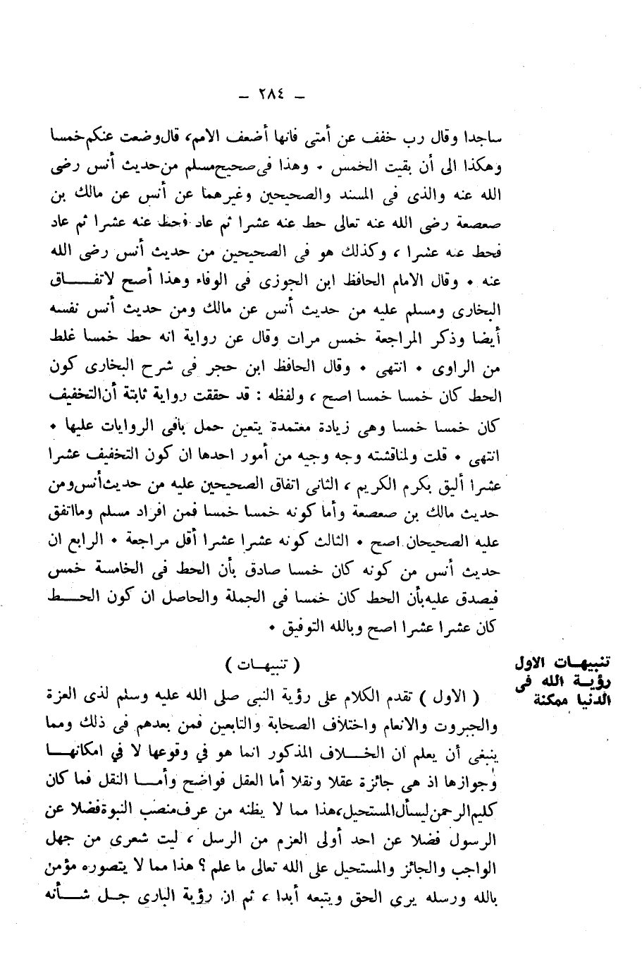 (الْأَوَّلُ) تَقَدَّمَ الْكَلَامُ عَلَى رُؤْيَةِ النَّبِيِّ - صَلَّى اللَّهُ عَلَيْهِ وَسَلَّمَ - لِذِي الْعِزَّةِ وَالْجَبَرُوتِ وَالْإِنْعَامِ، وَاخْتِلَافِ الصَّحَابَةِ وَالتَّابِعِينَ فَمَنْ بَعْدَهُمْ فِي ذَلِكَ، وَمِمَّا يَنْبَغِي أَنْ يُعْلَمَ أَنَّ الْخِلَافَ الْمَذْكُورَ إِنَّمَا هُوَ فِي وُقُوعِهَا، لَا فِي إِمْكَانِهَا وَجَوَازِهَا إِذْ هِيَ جَائِزَةٌ عَقْلًا وَنَقْلًا، أَمَّا الْعَقْلُ فَوَاضِحٌ، وَأَمَّا النَّقْلُ فَمَا كَانَ كَلِيمُ الرَّحْمَنِ لِيَسْأَلَ الْمُسْتَحِيلَ، هَذَا مِمَّا لَا يَظُنُّهُ مَنْ عَرَفَ مَنْصِبَ النُّبُوَّةِ فَضْلًا عَنِ الرَّسُولِ فَضْلًا عَنْ أَحَدِ أُولِي الْعَزْمِ مِنَ الرُّسُلِ، لَيْتَ شِعْرِي مَنْ جَهِلَ الْوَاجِبَ وَالْجَائِزَ وَالْمُسْتَحِيلَ عَلَى اللَّهِ تَعَالَى مَا عَلِمَ؟ هَذَا مِمَّا لَا يَتَصَوَّرُهُ مُؤْمِنٌ بِاللَّهِ وَرُسُلِهِ يَرَى الْحَقَّ وَيَتَّبِعُهُ أَبَدًا، ثُمَّ إِنَّ رُؤْيَةَ الْبَارِي جَلَّ شَأْنُهُ