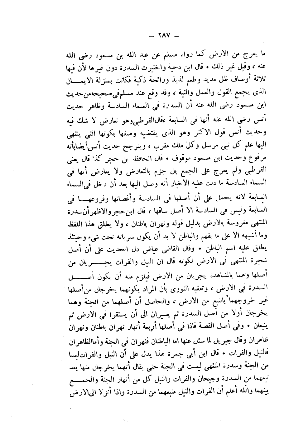 وَفِي أَصْلِ الْقِصَّةِ: فَإِذَا فِي أَصْلِهَا أَرْبَعَةُ أَنْهَارٍ نَهْرَانِ بَاطِنَانِ وَنَهْرَانِ ظَاهِرَانِ، وَقَالَ جِبْرِيلُ لَمَّا سُئِلَ عَنْهَا: أَمَّا الْبَاطِنَانِ فَنَهْرَانِ فِي الْجَنَّةِ، وَأَمَّا الظَّاهِرَانِ فَالنِّيلُ وَالْفُرَاتُ. قَالَ ابْنُ أَبِي جَمْرَةَ: هَذَا يَدُلُّ عَلَى أَنَّ النِّيلَ وَالْفُرَاتَ لَيْسَا مِنَ الْجَنَّةِ، وَسِدْرَةُ الْمُنْتَهَى لَيْسَتْ فِي الْجَنَّةِ حَتَّى يُقَالَ إِنَّهُمَا يَخْرُجَانِ مِنْهَا بَعْدَ نَبْعِهِمَا مِنَ السِّدْرَةِ، وَجَيْحَانُ وَالْفُرَاتُ وَالنِّيلُ كُلٌّ مِنْ أَنْهَارِ الْجَنَّةِ، وَالْجَمْعُ بَيْنَهُمَا وَاللَّهُ أَعْلَمُ أَنَّ الْفُرَاتَ وَالنِّيلَ مَنْبَعُهُمَا مِنَ السِّدْرَةِ، وَإِذَا أُنْزِلَا إِلَى الْأَرْضِ