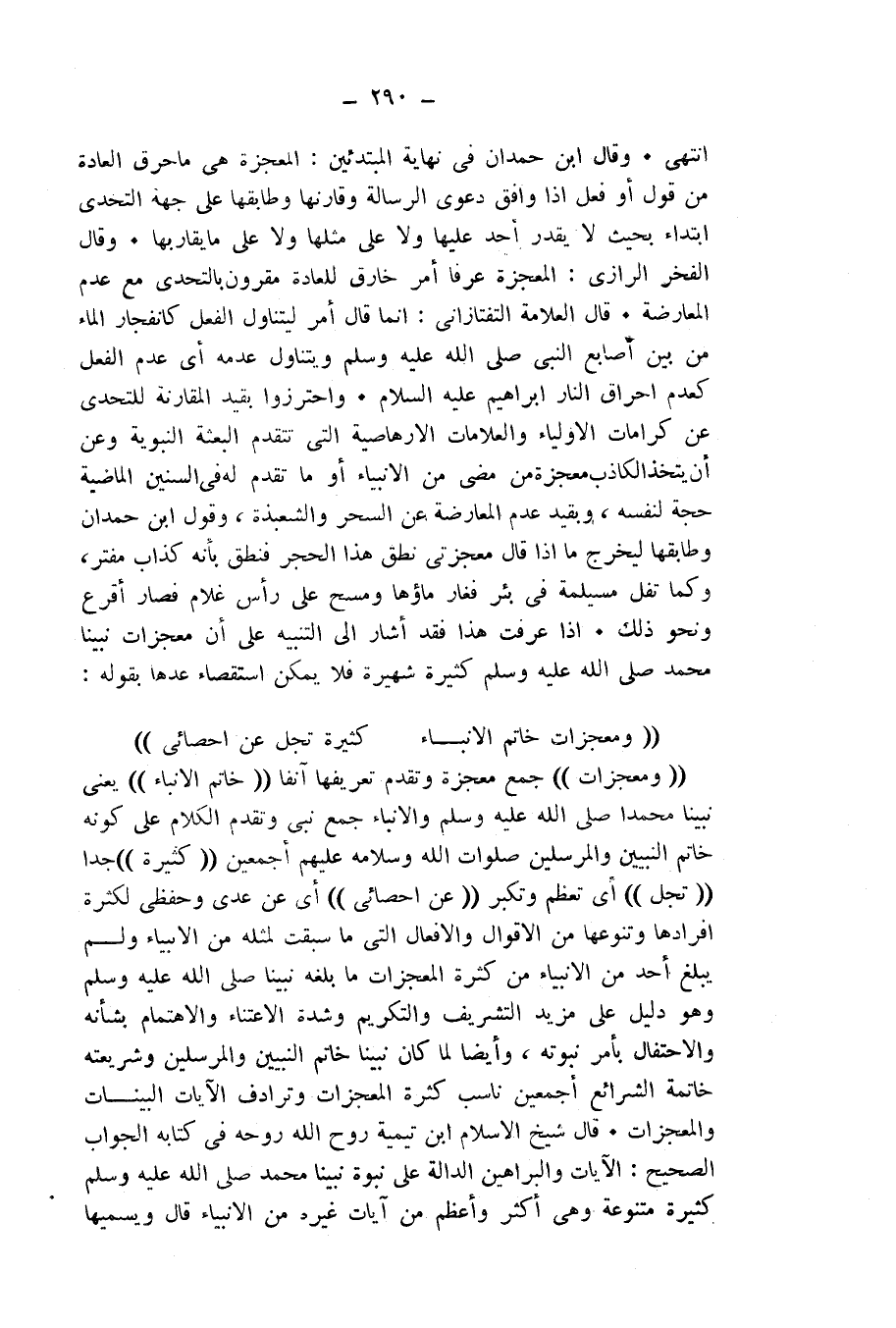 وَقَالَ ابْنُ حَمْدَانَ فِي نِهَايَةِ الْمُبْتَدِئِينَ: الْمُعْجِزَةُ هِيَ مَا خَرَقَ الْعَادَةَ مِنْ قَوْلٍ أَوْ فِعْلٍ إِذَا وَافَقَ دَعْوَى الرِّسَالَةِ وَقَارَنَهَا وَطَابَقَهَا عَلَى جِهَةِ التَّحَدِّي ابْتِدَاءً بِحَيْثُ لَا يَقْدِرُ أَحَدٌ عَلَيْهَا وَلَا عَلَى مِثْلِهَا، وَلَا عَلَى مَا يُقَارِبُهَا. وَقَالَ الْفَخْرُ الرَّازِيُّ: الْمُعْجِزَةُ عُرْفًا أَمْرٌ خَارِقٌ لِلْعَادَةِ مَقْرُونٌ بِالتَّحَدِّي مَعَ عَدَمِ الْمُعَارَضَةِ. قَالَ الْعَلَّامَةُ التَّفْتَازَانِيُّ: إِنَّمَا قَالَ أَمْرٌ لِيَتَنَاوَلَ الْفِعْلَ كَانْفِجَارِ الْمَاءِ مِنْ بَيْنِ أَصَابِعِ النَّبِيِّ - صَلَّى اللَّهُ عَلَيْهِ وَسَلَّمَ - وَيَتَنَاوَلَ عَدَمَهُ أَيْ عَدَمَ الْفِعْلِ كَعَدَمِ إِحْرَاقِ النَّارِ إِبْرَاهِيمَ عَلَيْهِ السَّلَامُ. وَاحْتَرَزُوا بِقَيْدِ الْمُقَارَنَةِ لِلتَّحَدِّي عَنْ كَرَامَاتِ الْأَوْلِيَاءِ، وَالْعَلَامَاتِ الْإِرْهَاصِيَّةِ الَّتِي تَتَقَدَّمُ الْبَعْثَةَ النَّبَوِيَّةَ وَعَنْ أَنْ يَتَّخِذَ الْكَاذِبُ مُعْجِزَةَ مَنْ مَضَى مِنَ الْأَنْبِيَاءِ أَوْ مَا تَقَدَّمَ لَهُ فِي السِّنِينَ الْمَاضِيَةِ حُجَّةً لِنَفْسِهِ، وَبِقَيْدِ عَدَمِ الْمُعَارَضَةِ عَنِ السِّحْرِ وَالشَّعْوَذَةِ، وَقَوْلُ ابْنِ حَمْدَانَ: (وَطَابَقَهَا) ؛ لِيُخْرِجَ مَا إِذَا قَالَ: مُعْجِزَتِي نُطْقُ هَذَا الْحَجَرِ، فَنَطَقَ بِأَنَّهُ كَذَّابٌ مُفْتَرٍ، وَكَمَا تَفَلَ مُسَيْلِمَةُ فِي بِئْرٍ فَغَارَ مَاؤُهَا، وَمَسَحَ عَلَى رَأْسِ غُلَامٍ فَصَارَ أَقْرَعَ وَنَحْوُ ذَلِكَ. إِذَا عَرَفْتَ هَذَا فَقَدَ أَشَارَ إِلَى التَّنْبِيهِ عَلَى أَنَّ مُعْجِزَاتِ نَبِيِّنَا مُحَمَّدٍ - صَلَّى اللَّهُ عَلَيْهِ وَسَلَّمَ - كَثِيرَةٌ فَلَا يُمْكِنُ اسْتِقْصَاءُ عَدَدِهَا بِقَوْلِهِ: