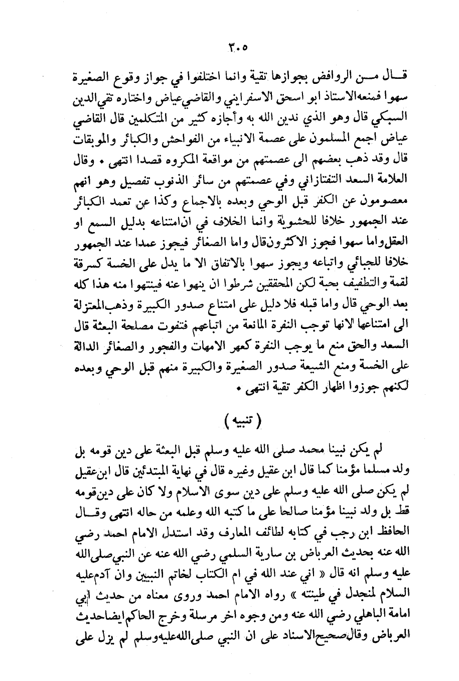 وَقَالَ الْعَلَّامَةُ السَّعْدُ التَّفْتَازَانِيُّ: وَفِي عِصْمَتِهِمْ مِنْ سَائِرِ الذُّنُوبِ تَفْصِيلٌ، وَهُوَ أَنَّهُمْ مَعْصُومُونَ عَنِ الْكُفْرِ، قَبْلَ الْوَحْيِ وَبَعْدَهُ بِالْإِجْمَاعِ، وَكَذَا عَنْ تَعَمُّدِ الْكَبَائِرِ عِنْدَ الْجُمْهُورِ خِلَافًا لِلْحَشْوِيَّةِ، وَإِنَّمَا الْخِلَافُ فِي أَنَّ امْتِنَاعَهُ بِدَلِيلِ السَّمْعِ أَوِ الْعَقْلِ، وَأَمَّا سَهْوًا فَجَوَّزَ الْأَكْثَرُونَ، قَالَ: وَأَمَّا الصَّغَائِرُ فَتَجُوزُ عَمْدًا عِنْدَ الْجُمْهُورِ خِلَافًا لِلْجُبَّائِيِّ وَأَتْبَاعِهِ، وَتَجُوزُ سَهْوًا بِالِاتِّفَاقِ إِلَّا مَا يَدُلُّ عَلَى الْخِسَّةِ كَسَرِقَةِ لُقْمَةٍ وَالتَّطْفِيفِ بِحَبَّةٍ، لَكِنَّ الْمُحَقِّقِينَ شَرَطُوا أَنْ يُنْهَوْا عَنْهُ فَيَنْتَهُوا مِنْهُ، هَذَا كُلُّهُ بَعْدَ الْوَحْيِ. قَالَ: وَأَمَّا قَبْلَهُ فَلَا دَلِيلَ عَلَى امْتِنَاعِ صُدُورِ الْكَبِيرَةِ، وَذَهَبَ الْمُعْتَزِلَةُ إِلَى امْتِنَاعِهَا، لِأَنَّهَا تُوجِبُ النَّفْرَةَ الْمَانِعَةَ مِنَ اتِّبَاعِهِمْ فَتَفُوتُ مَصْلَحَةُ الْبَعْثَةِ، قَالَ السَّعْدُ: وَالْحَقُّ مَنْعُ مَا يُوجِبُ النَّفْرَةَ كَعَهْرِ الْأُمَّهَاتِ وَالْفُجُورِ وَالصَّغَائِرِ الدَّالَّةِ عَلَى الْخِسَّةِ، وَمَنَعَ الشِّيعَةُ صُدُورَ الصَّغِيرَةِ وَالْكَبِيرَةِ مِنْهُمْ قَبْلَ الْوَحْيِ وَبَعْدَهُ وَلَكِنَّهُمْ جَوَّزُوا إِظْهَارَ الْكُفْرِ تَقِيَّةً. انْتَهَى.