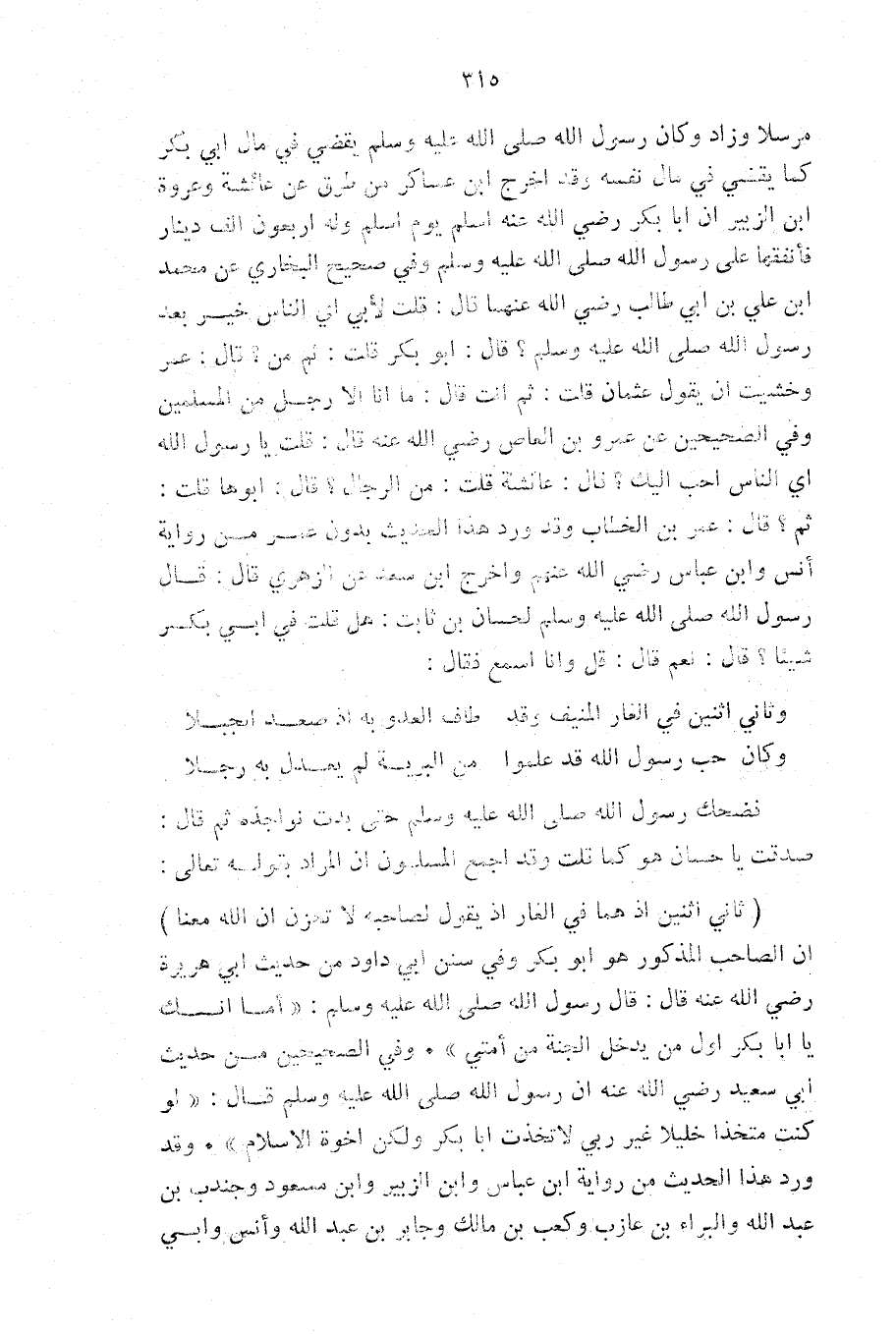 فَضَحِكَ رَسُولُ اللَّهِ - صَلَّى اللَّهُ عَلَيْهِ وَسَلَّمَ - حَتَّى بَدَتْ نَوَاجِذُهُ، ثُمَّ قَالَ: صَدَقْتَ يَا حَسَّانُ هُوَ كَمَا قُلْتَ» . وَقَدْ أَجْمَعَ الْمُسْلِمُونَ أَنَّ الْمُرَادَ بِقَوْلِهِ تَعَالَى: {ثَانِيَ اثْنَيْنِ إِذْ هُمَا فِي الْغَارِ إِذْ يَقُولُ لِصَاحِبِهِ لَا تَحْزَنْ إِنَّ اللَّهَ مَعَنَا} [التوبة: 40] أَنَّ الصَّاحِبَ الْمَذْكُورَ هُوَ أَبُو بَكْرٍ. وَفِي سُنَنِ أَبِي دَاوُدَ مِنْ حَدِيثِ أَبِي هُرَيْرَةَ - رَضِيَ اللَّهُ