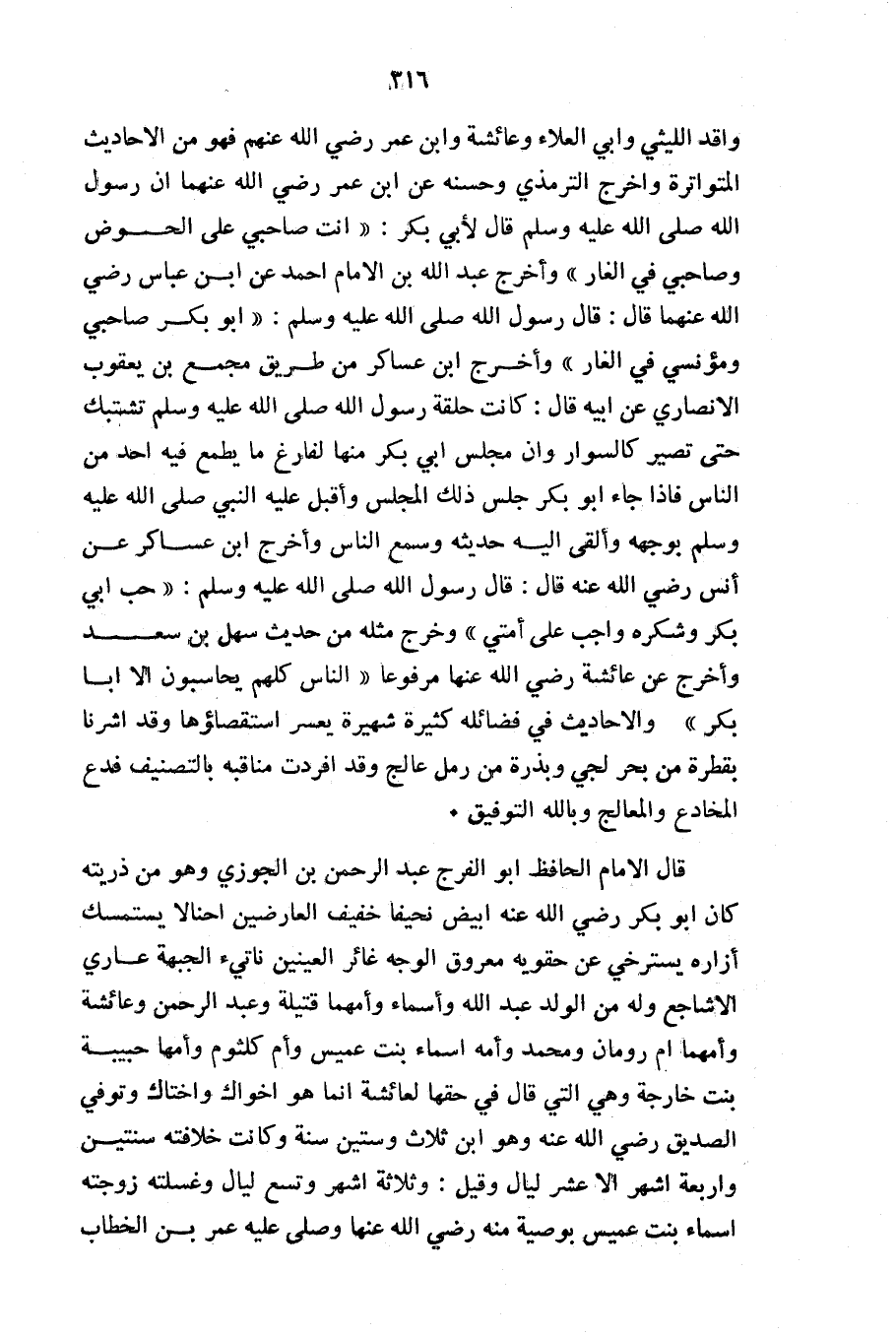 عَنْهُ - قَالَ: قَالَ رَسُولُ اللَّهِ - صَلَّى اللَّهُ عَلَيْهِ وَسَلَّمَ - " «أَمَا إِنَّكَ يَا أَبَا بَكْرٍ أَوَّلُ مَنْ يَدْخُلُ الْجَنَّةَ مِنْ أُمَّتِي» ". وَفِي الصَّحِيحَيْنِ مِنْ حَدِيثِ أَبِي سَعِيدٍ - رَضِيَ اللَّهُ عَنْهُ - أَنَّ رَسُولَ اللَّهِ - صَلَّى اللَّهُ عَلَيْهِ وَسَلَّمَ - قَالَ: " «لَوْ كُنْتُ مُتَّخِذًا خَلِيلًا غَيْرَ رَبِّي لَاتَّخَذْتُ أَبَا بَكْرٍ وَلَكِنْ أُخُوَّةُ الْإِسْلَامِ» ". وَقَدْ وَرَدَ هَذَا الْحَدِيثُ مِنْ رِوَايَةِ ابْنِ عَبَّاسٍ، وَابْنِ الزُّبَيْرِ، وَابْنِ مَسْعُودٍ، وَجُنْدُبِ بْنِ عَبْدِ اللَّهِ، وَالْبَرَاءِ بْنِ عَازِبٍ، وَكَعْبِ بْنِ مَالِكٍ، وَجَابِرِ بْنِ عَبَدِ اللَّهِ، وَأَنَسٍ، وَأَبِي وَاقِدٍ اللَّيْثِيِّ، وَأَبِي الْمُعَلَّى، وَعَائِشَةَ، وَابْنِ عُمَرَ - رَضِيَ اللَّهُ عَنْهُمْ - فَهُوَ مِنَ الْأَحَادِيثِ الْمُتَوَاتِرَةِ. وَأَخْرَجَ التِّرْمِذِيُّ وَحَسَّنَهُ عَنِ ابْنِ عُمَرَ - رَضِيَ اللَّهُ عَنْهُمَا - أَنَّ رَسُولَ اللَّهِ - صَلَّى اللَّهُ عَلَيْهِ وَسَلَّمَ - قَالَ لِأَبِي بَكْرٍ: " «أَنْتَ صَاحِبِي عَلَى الْحَوْضِ وَصَاحِبِي فِي الْغَارِ» ". وَأَخْرَجَ عَبْدُ اللَّهِ بْنُ الْإِمَامِ أَحْمَدَ عَنِ ابْنِ عَبَّاسٍ - رَضِيَ اللَّهُ عَنْهُمَا - قَالَ: قَالَ رَسُولُ اللَّهِ - صَلَّى اللَّهُ عَلَيْهِ وَسَلَّمَ -: " «أَبُو بَكْرٍ صَاحِبِي وَمُؤْنِسِي فِي الْغَارِ» ". وَأَخْرَجَ ابْنُ عَسَاكِرَ مِنْ طَرِيقِ مُجَمِّعِ بْنِ يَعْقُوبَ الْأَنْصَارِيِّ عَنْ أَبِيهِ، قَالَ: كَانَتْ حَلْقَةُ رَسُولِ اللَّهِ - صَلَّى اللَّهُ عَلَيْهِ وَسَلَّمَ - تَشْتَبِكُ حَتَّى تَصِيرَ كَالسِّوَارِ، وَإِنَّ مَجْلِسَ أَبِي بَكْرٍ مِنْهَا لَفَارِغٌ، مَا يَطْمَعُ فِيهِ أَحَدٌ مِنَ النَّاسِ، فَإِذَا جَاءَ أَبُو بَكْرٍ جَلَسَ ذَلِكَ الْمَجْلِسَ، وَأَقْبَلَ عَلَيْهِ النَّبِيُّ - صَلَّى اللَّهُ عَلَيْهِ وَسَلَّمَ - بِوَجْهِهِ، وَأَلْقَى إِلَيْهِ حَدِيثَهُ، وَسَمِعَ النَّاسُ. وَأَخْرَجَ ابْنُ عَسَاكِرَ عَنْ أَنَسٍ - رَضِيَ اللَّهُ عَنْهُ - قَالَ: قَالَ رَسُولُ اللَّهِ - صَلَّى اللَّهُ عَلَيْهِ وَسَلَّمَ -: " «حُبُّ أَبِي بَكْرٍ وَشُكْرُهُ وَاجِبٌ عَلَى أُمَّتِي» ".، وَخَرَّجَ مِثْلَهُ مِنْ حَدِيثِ سَهْلِ بْنِ سَعْدٍ. وَأَخْرَجَ عَنْ عَائِشَةَ - رَضِيَ اللَّهُ عَنْهَا - مَرْفُوعًا: " «النَّاسُ كُلُّهُمْ يُحَاسَبُونَ إِلَّا أَبَا بَكْرٍ» ". وَالْأَحَادِيثُ فِي فَضَائِلِهِ كَثِيرَةٌ شَهِيرَةٌ يَعْسُرُ اسْتِقْصَاؤُهَا، وَقَدْ أَشَرْنَا بِقَطْرَةٍ مِنْ بَحْرٍ لُجِّيٍّ، وَبِذَرَّةٍ مِنْ رَمْلٍ عَالِجٍ، وَقَدْ أُفْرِدَتْ مَنَاقِبُهُ بِالتَّصْنِيفِ، فَدَعِ الْمُخَادِعَ وَالْمُعَالِجَ، وَبِاللَّهِ التَّوْفِيقُ.