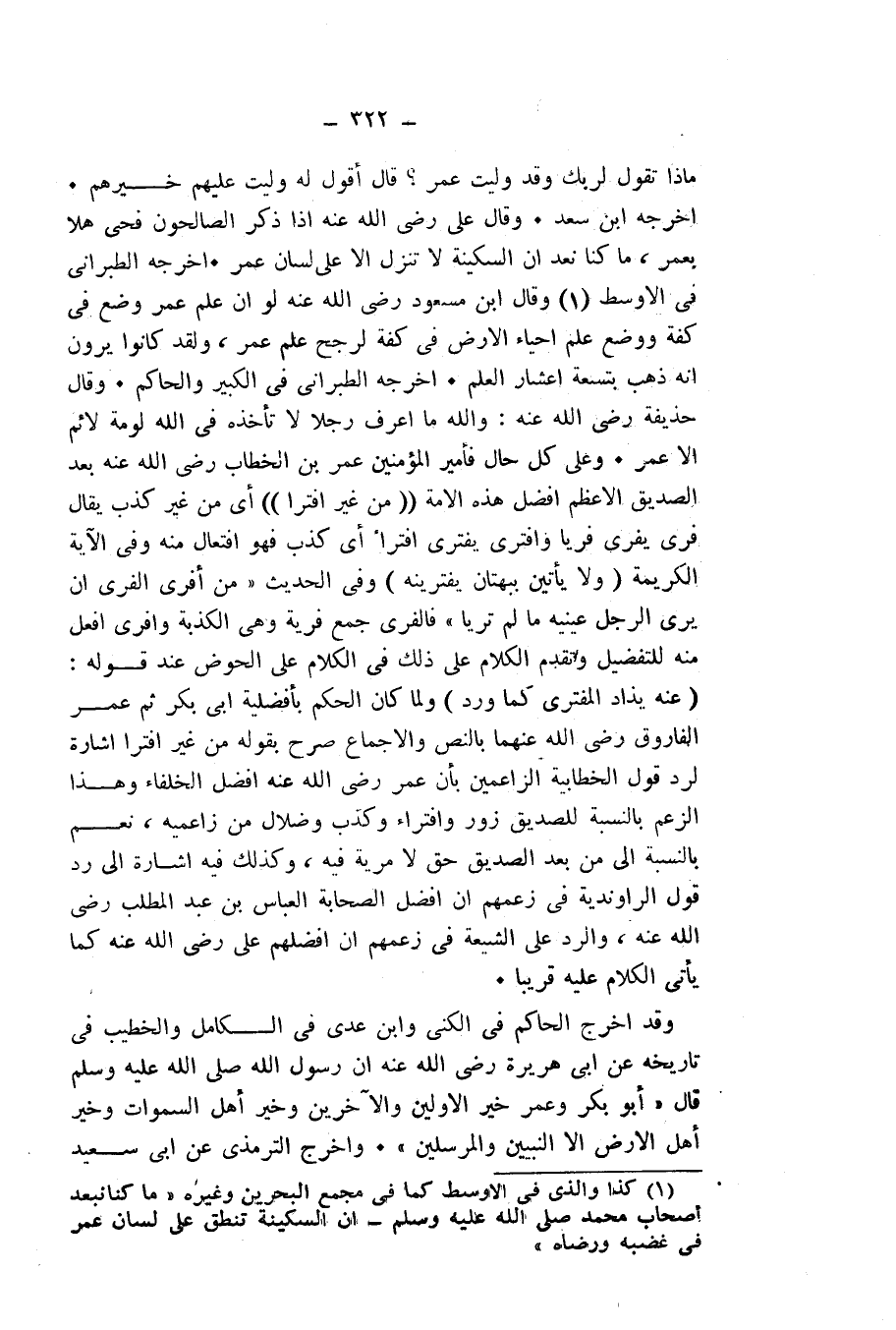 وَعَلَى كُلِّ حَالٍ فَأَمِيرُ الْمُؤْمِنِينَ عُمَرُ بْنُ الْخَطَّابِ - رَضِيَ اللَّهُ عَنْهُ - بَعْدَ الصِّدِّيقِ الْأَعْظَمِ أَفْضَلُ هَذِهِ الْأُمَّةِ ((مِنْ غَيْرِ افْتِرَا)) أَيْ مِنْ غَيْرِ الْكَذِبِ يُقَالُ فَرِيَ يَفْرِي فَرْيًا وَافْتَرَى يَفْتَرِي افْتِرَاءً أَيْ كَذِبَ فَهُوَ افْتِعَالٌ مِنْهُ، وَفِي الْآيَةِ الْكَرِيمَةِ: {وَلَا يَأْتِينَ بِبُهْتَانٍ يَفْتَرِينَهُ} [الممتحنة: 12] وَفِي الْحَدِيثِ: " «مِنْ أَفْرَى الْفِرَى أَنْ يُرِيَ الرَّجُلُ عَيْنَيْهِ مَا لَمْ تَرَيَا» ". فَالْفِرَى جَمْعُ فِرْيَةٍ وَهِيَ الْكَذِبَةُ، وَأَفْرَى أَفْعَلُ مِنْهُ لِلتَّفْضِيلِ، وَتَقَدَّمَ الْكَلَامُ عَلَى ذَلِكَ فِي الْكَلَامِ عَلَى الْحَوْضِ عِنْدَ قَوْلِهِ: (عَنْهُ يُذَادُ الْمُفْتَرِي كَمَا وَرَدَ) ، وَلَمَّا كَانَ الْحُكْمُ بِأَفْضَلِيَّةِ أَبِي بَكْرٍ ثُمَّ عُمَرَ الْفَارُوقِ - رَضِيَ اللَّهُ عَنْهُمَا - بِالنَّصِّ وَالْإِجْمَاعِ صَرَّحَ بِقَوْلِهِ: مِنْ غَيْرِ افْتِرَا؛ إِشَارَةً لِرَدِّ قَوْلِ الْخَطَّابِيَّةِ الزَّاعِمِينَ بِأَنَّ عُمَرَ - رَضِيَ اللَّهُ عَنْهُ - أَفْضَلُ الْخُلَفَاءِ، وَهَذَا الزَّعْمُ بِالنِّسْبَةِ لِلصِّدِّيقِ زُورٌ وَافْتِرَاءٌ وَكَذِبٌ وَضَلَالٌ مِنْ زَاعِمِيهِ، نَعَمْ بِالنِّسْبَةِ إِلَى مَنْ بَعْدَ الصِّدِّيقِ حَقٌّ لَا مِرْيَةَ فِيهِ، وَكَذَلِكَ فِيهِ إِشَارَةٌ إِلَى رَدِّ قَوْلِ الرَّاوَنْدِيَّةِ فِي زَعْمِهِمْ أَنَّ أَفْضَلَ الصَّحَابَةِ الْعَبَّاسُ بْنُ عَبْدِ الْمُطَّلِبِ - رَضِيَ اللَّهُ عَنْهُ -، وَالرَّدُّ عَلَى الشِّيعَةِ فِي زَعْمِهِمْ أَنَّ أَفْضَلَهُمْ عَلِيٌّ - رَضِيَ اللَّهُ عَنْهُ - كَمَا يَأْتِي الْكَلَامُ عَلَيْهِ قَرِيبًا.