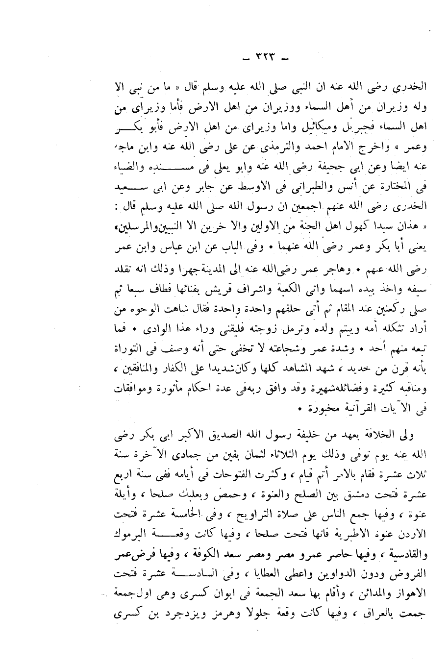الْخُدْرِيِّ - رَضِيَ اللَّهُ عَنْهُ - أَنَّ النَّبِيَّ - صَلَّى اللَّهُ عَلَيْهِ وَسَلَّمَ - قَالَ: " «مَا مِنْ نَبِيٍّ إِلَّا وَلَهُ وَزِيرَانِ مِنْ أَهْلِ السَّمَاءِ، وَوَزِيرَانِ مِنْ أَهْلِ الْأَرْضِ، فَأَمَّا وَزِيرَايَ مِنْ أَهْلِ السَّمَاءِ فَجِبْرِيلُ وَمِيكَائِيلُ، وَأَمَّا وَزِيرَايَ مِنْ أَهْلِ الْأَرْضِ فَأَبُو بَكْرٍ وَعُمَرُ» ". وَأَخْرَجَ الْإِمَامُ أَحْمَدُ وَالتِّرْمِذِيُّ عَنْ عَلِيٍّ - رَضِيَ اللَّهُ عَنْهُ - وَابْنُ مَاجَهْ عَنْهُ أَيْضًا، وَعَنْ أَبِي جُحَيْفَةَ - رَضِيَ اللَّهُ عَنْهُ - وَأَبُو يَعْلَى فِي مُسْنَدِهِ، وَالضِّيَاءُ فِي الْمُخْتَارَةِ عَنْ أَنَسٍ، وَالطَّبَرَانِيُّ فِي الْأَوْسَطِ عَنْ جَابِرٍ، وَعَنْ أَبِي سَعِيدٍ الْخُدْرِيِّ - رَضِيَ اللَّهُ عَنْهُمْ أَجْمَعِينَ - أَنَّ رَسُولَ اللَّهِ - صَلَّى اللَّهُ عَلَيْهِ وَسَلَّمَ - قَالَ: «هَذَانِ سَيِّدَا كُهُولِ أَهْلِ الْجَنَّةِ مِنَ الْأَوَّلِينَ وَالْآخِرِينَ إِلَّا النَّبِيِّينَ وَالْمُرْسَلِينَ» ". - يَعْنِي أَبَا بَكْرٍ وَعُمَرَ رَضِيَ اللَّهُ عَنْهُمَا -. وَفِي الْبَابِ عَنِ ابْنِ عَبَّاسٍ وَابْنِ عُمَرَ - رَضِيَ اللَّهُ عَنْهُمْ -.