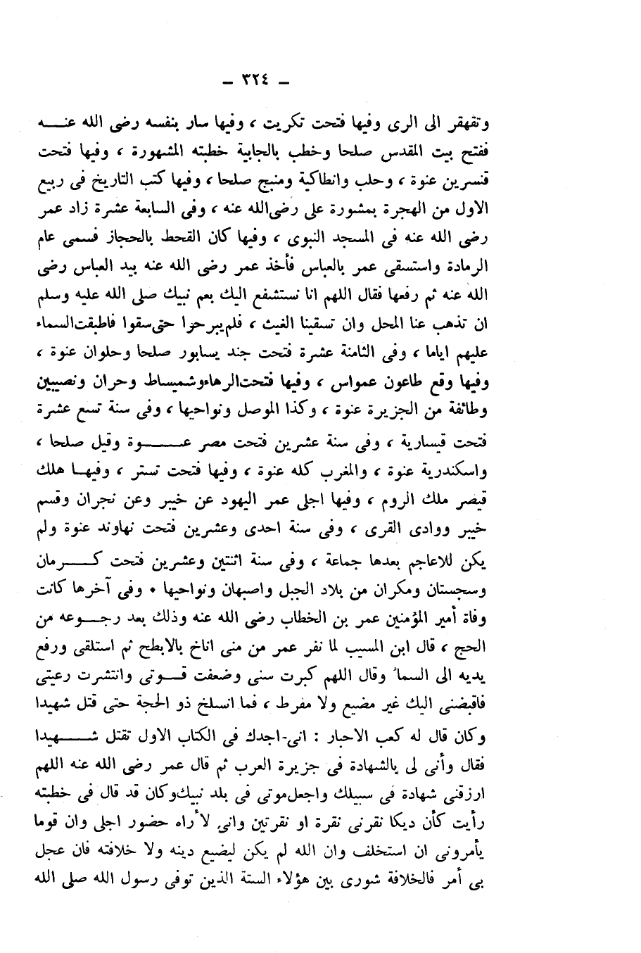 وَفِي سَنَةِ تِسْعَ عَشْرَةَ فُتِحَتْ قَيْسَارِيَّةُ، وَفِي سَنَةِ عِشْرِينَ فُتِحَتْ مِصْرُ عَنْوَةً وَقِيلَ صُلْحًا، وَإِسْكَنْدَرِيَّةُ عَنْوَةً، وَالْمَغْرِبُ كُلُّهُ عَنْوَةً، وَفِيهَا فُتِحَتْ تُسْتَرُ، وَفِيهَا هَلَكَ قَيْصَرُ مَلِكُ الرُّومِ، وَفِيهَا أَجْلَى عُمَرُ الْيَهُودَ عَنْ خَيْبَرَ وَعَنْ نَجْرَانَ وَقَسَّمَ خَيْبَرَ وَوَادِي الْقُرَى، وَفِي سَنَةَ إِحْدَى وَعِشْرِينَ فُتِحَتْ نَهَاوَنْدُ عَنْوَةً وَلَمْ يَكُنْ لِلْأَعَاجِمِ بَعْدَهَا جَمَاعَةٌ، وَفِي سَنَةِ اثْنَتَيْنِ وَعِشْرِينَ فُتِحَتْ كِرْمَانُ وَسِجِسْتَانُ وَمَكْرَانُ مِنْ بِلَادِ الْجَبَلِ وَأَصْبَهَانُ وَنَوَاحِيهَا. وَفِي آخِرِهَا كَانَتْ وَفَاةُ أَمِيرِ الْمُؤْمِنِينَ عُمَرَ بْنِ الْخَطَّابِ - رَضِيَ اللَّهُ عَنْهُ - وَذَلِكَ بَعْدَ رُجُوعِهِ مِنَ الْحَجِّ.