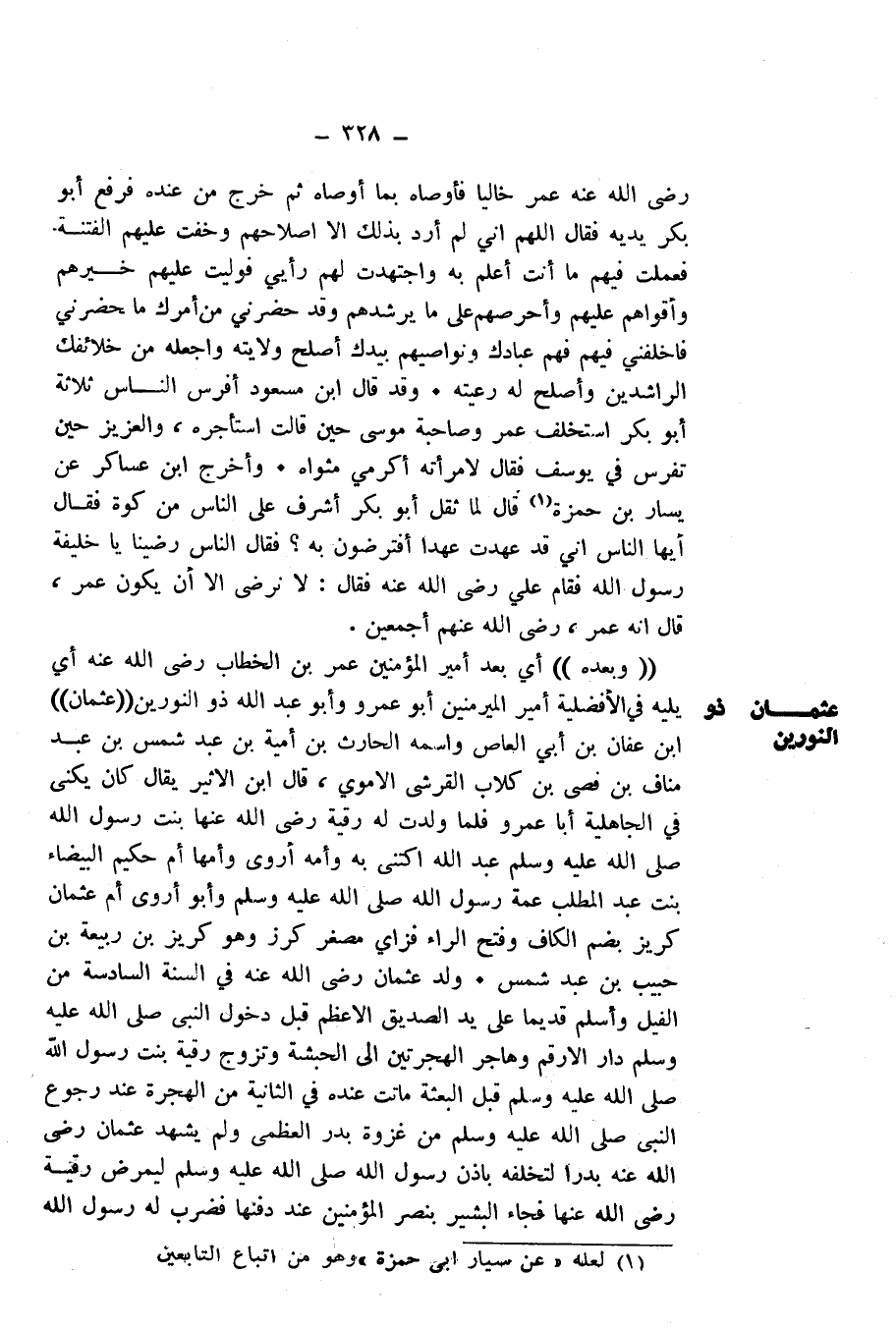 ((وَبَعْدَهُ)) أَيْ بَعْدَ أَمِيرِ الْمُؤْمِنِينَ عُمَرَ بْنِ الْخَطَّابِ - رَضِيَ اللَّهُ عَنْهُ - أَيْ يَلِيهِ فِي الْأَفْضَلِيَّةِ أَمِيرُ الْمُؤْمِنِينَ أَبُو عَمْرٍو وَأَبُو عَبْدِ اللَّهِ ذُو النُّورَيْنِ ((عُثْمَانُ)) بْنُ عَفَّانَ بْنِ أَبِي الْعَاصِ، وَاسْمُهُ الْحَارِثُ بْنُ أُمَيَّةَ بْنِ عَبْدِ شَمْسِ بْنِ عَبْدِ مَنَافِ بْنِ قُصَيِّ بْنِ كِلَابٍ الْقُرَشِيُّ الْأُمَوِيُّ، قَالَ ابْنُ الْأَثِيرِ: يُقَالُ كَانَ يُكَنَّى فِي الْجَاهِلِيَّةِ أَبَا عَمْرٍو، فَلَمَّا وَلَدَتْ لَهُ رُقَيَّةُ - رَضِيَ اللَّهُ عَنْهَا - بِنْتُ رَسُولِ اللَّهِ - صَلَّى اللَّهُ عَلَيْهِ وَسَلَّمَ - عَبْدَ اللَّهِ اكْتَنَى بِهِ، وَأُمُّهُ أَرْوَى وَأُمُّهَا أُمُّ حَكِيمٍ الْبَيْضَاءُ بِنْتُ عَبْدِ الْمُطَّلِبِ عَمَّةُ رَسُولِ اللَّهِ - صَلَّى اللَّهُ عَلَيْهِ وَسَلَّمَ -، وَأَبُو أَرْوَى أُمِّ عُثْمَانَ كُرَيْزٌ - بِضَمِّ الْكَافِ وَفَتْحِ الرَّاءِ فَزَايٌ مُصَغَّرُ كُرْزٍ -، وَهُوَ كُرَيْزُ بْنُ رَبِيعَةَ بْنِ حَبِيبِ بْنِ عَبْدِ شَمْسٍ.