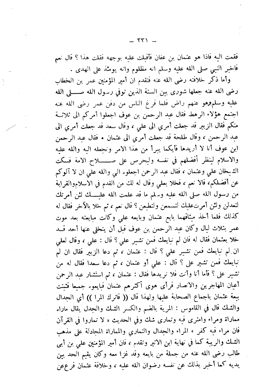 ثُمَّ اسْتَشَارَ عَبْدُ الرَّحْمَنِ أَعْيَانَ الْمُهَاجِرِينَ وَالْأَنْصَارِ، فَرَأَى هَوَى أَكْثَرُهُمْ عُثْمَانَ، فَبَايَعُوا جَمِيعًا فَثَبَتَتْ بَيْعَةُ عُثْمَانَ بِإِجْمَاعِ الصَّحَابَةِ عَلَيْهَا، وَلِهَذَا قَالَ: ((فَاتْرُكِ الْمِرَا)) أَيِ الْجِدَالَ وَالشَّكَّ، قَالَ فِي الْقَامُوسِ: الْمِرْيَةُ بِالضَّمِّ وَالْكَسْرِ الشَّكُّ وَالْجَدَلُ يُقَالُ مَارَاهُ مُمَارَاةً وَمِرَاءً وَامْتَرَى فِيهِ وَتَمَارَى شَكَّ، وَفِي الْحَدِيثِ: " «لَا تُمَارُوا فِي الْقُرْآنِ فَإِنَّ مِرَاءً فِيهِ كُفْرٌ» ". الْمِرَاءُ وَالْجِدَالُ وَالتَّمَارِي وَالْمُمَارَاةُ الْمُجَادَلَةُ عَلَى مَذْهَبِ الشَّكِّ وَالرِّيبَةِ، كَمَا فِي نِهَايَةِ ابْنِ الْأَثِيرِ وَتَقَدَّمَ، فَإِنَّ أَمِيرَ الْمُؤْمِنِينَ عَلِيُّ بْنُ أَبِي طَالِبٍ - رَضِيَ اللَّهُ عَنْهُ - مِنْ جُمْلَةِ مَنْ بَايَعَهُ وَقَدْ غَزَا مَعَهُ، وَكَانَ يُقِيمُ الْحَدَّ بَيْنَ يَدَيْهِ كَمَا أَخْبَرَ بِذَلِكَ عَنْ نَفْسِهِ - رِضْوَانُ اللَّهِ عَلَيْهِ -، وَخِلَافَةُ عُثْمَانَ فَرْعٌ عَنْ