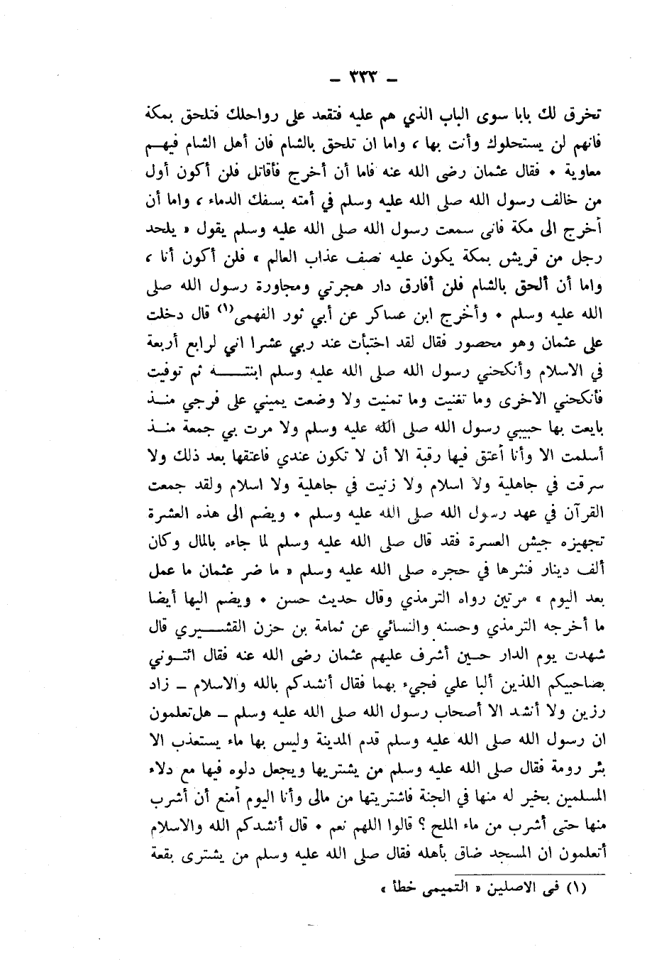 وَيُضَمُّ إِلَى هَذِهِ الْعَشَرَةِ تَجْهِيزُهُ جَيْشَ الْعُسْرَةِ، فَقَدْ قَالَ - صَلَّى اللَّهُ عَلَيْهِ وَسَلَّمَ - لَمَّا جَاءَهُ بِالْمَالِ وَكَانَ أَلْفَ دِينَارٍ فَنَثَرَهَا فِي حِجْرِهِ - صَلَّى اللَّهُ عَلَيْهِ وَسَلَّمَ -: " «مَا ضَرَّ عُثْمَانَ مَا عَمِلَ بَعْدَ الْيَوْمِ» " مَرَّتَيْنِ، رَوَاهُ التِّرْمِذِيُّ وَقَالَ: حَدِيثٌ حَسَنٌ، وَيُضَمُّ إِلَيْهَا أَيْضًا مَا أَخْرَجَهُ التِّرْمِذِيُّ وَحَسَّنَهُ وَالنَّسَائِيُّ عَنْ ثُمَامَةَ بْنِ حَزْنٍ الْقُشَيْرِيِّ قَالَ: شَهِدَتُ يَوْمَ الدَّارِ حِينَ أَشْرَفَ عَلَيْهِمْ عُثْمَانُ - رَضِيَ اللَّهُ عَنْهُ - فَقَالَ: ائْتُونِي بِصَاحِبَيْكُمُ اللَّذَيْنِ أَلَّبَا عَلَيَّ، فَجِيءَ بِهِمَا فَقَالَ: أَنْشُدُكُمْ بِاللَّهِ وَالْإِسْلَامِ - زَادَ رَزِينٌ وَلَا أَنْشُدُ إِلَّا أَصْحَابَ رَسُولِ اللَّهِ - صَلَّى اللَّهُ عَلَيْهِ وَسَلَّمَ - هَلْ تَعْلَمُونَ أَنَّ رَسُولَ اللَّهِ - صَلَّى اللَّهُ عَلَيْهِ وَسَلَّمَ - قَدِمَ الْمَدِينَةَ وَلَيْسَ بِهَا مَاءٌ يُسْتَعْذَبُ إِلَّا بِئْرُ رُومَةَ، فَقَالَ - صَلَّى اللَّهُ عَلَيْهِ وَسَلَّمَ -: «مَنْ يَشْتَرِيهَا وَيَجْعَلُ دَلْوَهُ فِيهَا مَعَ دِلَاءِ الْمُسْلِمِينَ بِخَيْرٍ لَهُ مِنْهَا فِي الْجَنَّةِ، فَاشْتَرَيْتُهَا مِنْ مَالِي؟ وَأَنَا الْيَوْمُ أُمْنَعُ أَنْ أَشْرَبَ مِنْهَا حَتَّى أَشْرَبَ مِنْ مَاءِ الْمِلْحِ؟ قَالُوا: اللَّهُمَّ نَعَمْ. قَالَ: أَنْشُدُكُمُ اللَّهَ وَالْإِسْلَامَ أَتَعْلَمُونَ أَنَّ الْمَسْجِدَ ضَاقَ بِأَهْلِهِ، فَقَالَ - صَلَّى اللَّهُ عَلَيْهِ وَسَلَّمَ -: مَنْ يَشْتَرِي بُقْعَةَ