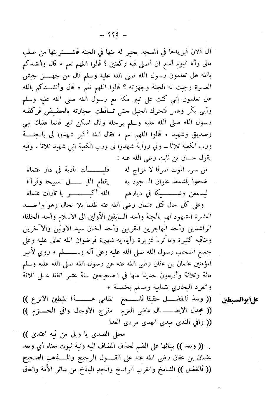آلِ فُلَانٍ فَيَزِيدُهَا فِي الْمَسْجِدِ بِخَيْرٍ لَهُ مِنْهَا فِي الْجَنَّةِ، فَاشْتَرَيْتُهَا مِنْ صُلْبِ مَالِي؟ وَأَنَا الْيَوْمُ أُمْنَعُ أَنْ أُصَلِّيَ فِيهِ رَكْعَتَيْنِ؟ قَالُوا: اللَّهُمَّ نَعَمْ. قَالَ: وَأَنْشُدُكُمْ بِاللَّهِ هَلْ تَعْلَمُونَ رَسُولَ اللَّهِ - صَلَّى اللَّهُ عَلَيْهِ وَسَلَّمَ - قَالَ: مَنْ جَهَّزَ جَيْشَ الْعُسْرَةِ وَجَبَتْ لَهُ الْجَنَّةُ وَجَهَّزْتُهُ؟ قَالُوا: اللَّهُمَّ نَعَمْ. قَالَ: وَأَنْشُدُكُمْ بِاللَّهِ هَلْ تَعْلَمُونَ أَنِّي كُنْتُ عَلَى ثَبِيرِ مَكَّةَ مَعَ رَسُولِ اللَّهِ - صَلَّى اللَّهُ عَلَيْهِ وَسَلَّمَ - وَأَبِي بَكْرٍ وَعُمَرَ فَتَحَرَّكَ الْجَبَلُ حَتَّى تَسَاقَطَتْ حِجَارَتُهُ بِالْحَضِيضِ، فَرَكَضَهُ رَسُولُ اللَّهِ - صَلَّى اللَّهُ عَلَيْهِ وَسَلَّمَ - بِرِجْلِهِ وَقَالَ: اسْكُنْ ثَبِيرُ فَإِنَّمَا عَلَيْكَ نَبِيٌّ وَصِدِّيقٌ وَشَهِيدٌ؟ قَالُوا: اللَّهُمَّ نَعَمْ. فَقَالَ: اللَّهُ أَكْبَرُ شَهِدُوا لِي بِالْجَنَّةِ وَرَبِّ الْكَعْبَةِ ثَلَاثًا» - وَفِي رِوَايَةٍ شَهِدُوا لِي وَرَبِّ الْكَعْبَةِ أَنِّي شَهِيدٌ ثَلَاثًا.