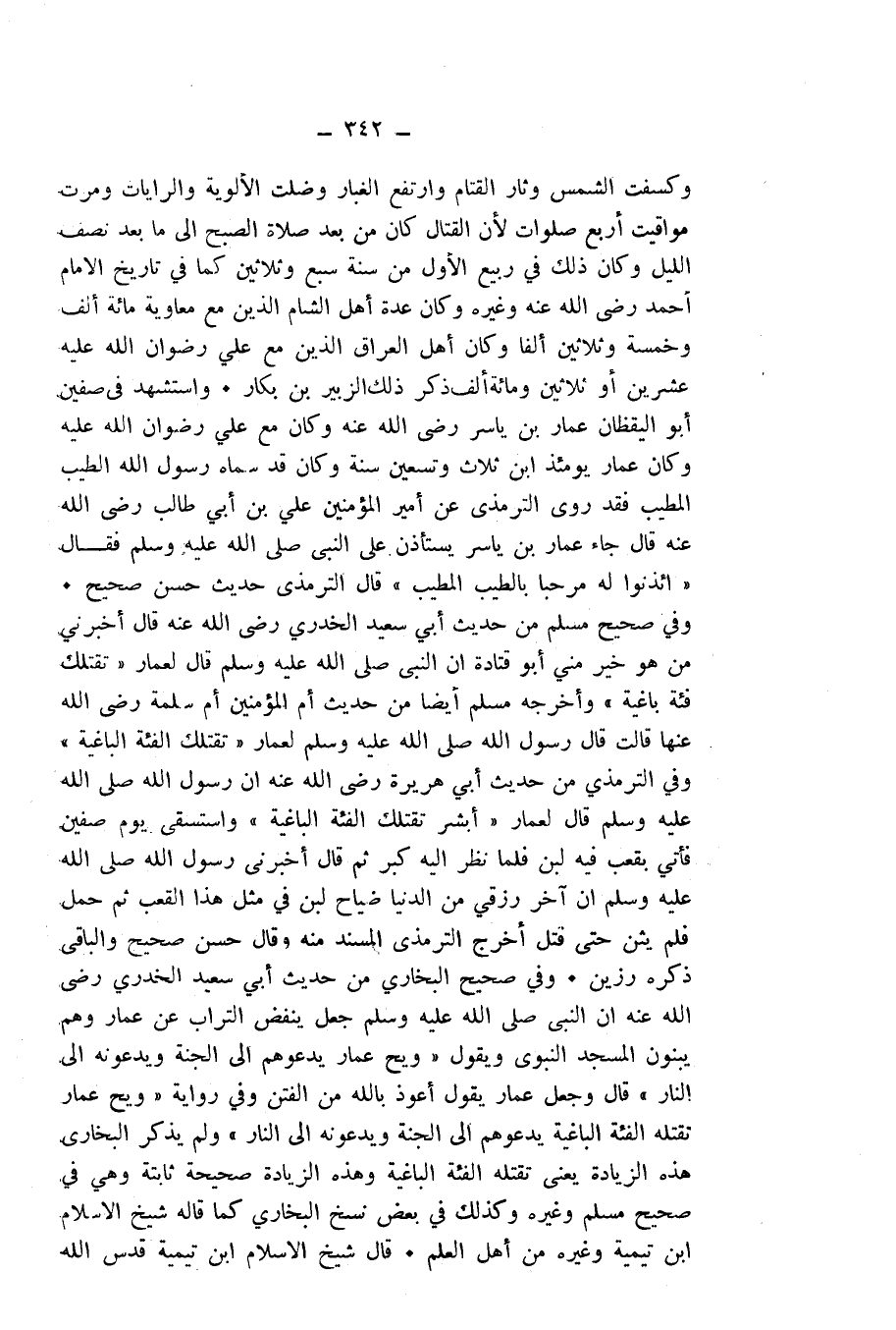 وَكَسَفَتِ الشَّمْسُ وَثَارَ الْقَتَامُ وَارْتَفَعَ الْغُبَارُ، وَضَلَّتِ الْأَلْوِيَةُ وَالرَّايَاتُ، وَمَرَّتْ مَوَاقِيتُ أَرْبَعِ صَلَوَاتٍ، لِأَنَّ الْقِتَالَ كَانَ مِنْ بَعْدِ صَلَاةِ الصُّبْحِ إِلَى مَا بَعْدَ نِصْفِ اللَّيْلِ، وَكَانَ ذَلِكَ فِي رَبِيعٍ الْأَوَّلِ مِنْ سَنَةَ سَبْعٍ وَثَلَاثِينَ كَمَا فِي تَارِيخِ الْإِمَامِ أَحْمَدَ - رَضِيَ اللَّهُ عَنْهُ - وَغَيْرِهِ، وَكَانَ عِدَّةُ أَهْلِ الشَّامِ الَّذِينَ مَعَ مُعَاوِيَةَ مِائَةَ أَلْفٍ وَخَمْسَةً وَثَلَاثِينَ أَلْفًا، وَكَانَ أَهْلُ الْعِرَاقِ الَّذِينَ مَعَ عَلِيٍّ رِضْوَانُ اللَّهِ عَلَيْهِ عِشْرِينَ أَوْ ثَلَاثِينَ وَمِائَةَ أَلْفٍ، ذَكَرَ ذَلِكَ الزُّبَيْرُ بْنُ بَكَّارٍ. وَاسْتُشْهِدَ فِي صِفِّينَ أَبُو الْيَقْظَانِ عَمَّارُ بْنُ يَاسِرٍ - رَضِيَ اللَّهُ عَنْهُ - وَكَانَ مَعَ عَلِيٍّ - رِضْوَانُ اللَّهِ عَلَيْهِ -، وَكَانَ عَمَّارٌ يَوْمَئِذٍ ابْنُ ثَلَاثٍ وَتِسْعِينَ سَنَةً، وَكَانَ قَدْ سَمَّاهُ رَسُولُ اللَّهِ الطَّيِّبُ الْمُطَيَّبُ، فَقَدْ رَوَى التِّرْمِذِيُّ عَنْ أَمِيرِ الْمُؤْمِنِينَ عَلِيِّ بْنِ أَبِي طَالِبٍ - رَضِيَ اللَّهُ عَنْهُ - قَالَ: جَاءَ عَمَّارُ بْنُ يَاسِرٍ يَسْتَأْذِنُ عَلَى النَّبِيِّ - صَلَّى اللَّهُ عَلَيْهِ وَسَلَّمَ - فَقَالَ: " «ائْذَنُوا لَهُ مَرْحَبًا بِالطَّيِّبِ الْمُطَيَّبِ» ". قَالَ التِّرْمِذِيُّ: حَدِيثٌ حَسَنٌ صَحِيحٌ. وَفِي صَحِيحِ مُسْلِمٍ مِنْ حَدِيثِ أَبِي سَعِيدٍ الْخُدْرِيِّ - رَضِيَ اللَّهُ عَنْهُ - قَالَ: أَخْبَرَنِي مَنْ هُوَ خَيْرٌ مِنِّي أَبُو قَتَادَةَ أَنَّ النَّبِيَّ - صَلَّى اللَّهُ عَلَيْهِ وَسَلَّمَ - قَالَ لِعَمَّارٍ: " «تَقْتُلُكَ فِئَةٌ بَاغِيَةٌ» ". وَأَخْرَجَهُ مُسْلِمٌ أَيْضًا مِنْ حَدِيثِ أُمِّ الْمُؤْمِنِينَ أُمِّ سَلَمَةَ - رَضِيَ اللَّهُ عَنْهَا - قَالَتْ: «قَالَ رَسُولُ اللَّهِ - صَلَّى اللَّهُ عَلَيْهِ وَسَلَّمَ - لِعَمَّارٍ: " تَقْتُلُكَ الْفِئَةُ الْبَاغِيَةُ» ". وَفِي التِّرْمِذِيِّ مِنْ حَدِيثِ أَبِي هُرَيْرَةَ - رَضِيَ اللَّهُ عَنْهُ - «أَنَّ رَسُولَ اللَّهِ - صَلَّى اللَّهُ عَلَيْهِ وَسَلَّمَ - قَالَ لِعَمَّارٍ: " أَبْشِرْ تَقْتُلُكَ الْفِئَةُ الْبَاغِيَةُ» ". وَاسْتَسْقَى يَوْمَ صِفِّينَ فَأُتِيَ بِقَعْبٍ فِيهِ لَبَنٌ فَلَمَّا نَظَرَ إِلَيْهِ كَبَّرَ، ثُمَّ قَالَ: «أَخْبَرَنِي رَسُولُ اللَّهِ - صَلَّى اللَّهُ عَلَيْهِ وَسَلَّمَ - أَنَّ آخِرَ رِزْقِي مِنَ الدُّنْيَا ضَيَاحُ لَبَنٍ فِي مِثْلِ هَذَا الْقَعْبِ، ثُمَّ حَمَلَ فَلَمْ يَثْنِ حَتَّى قُتِلَ» أَخْرَجَ التِّرْمِذِيُّ الْمُسْنَدَ مِنْهُ وَقَالَ: حَسَنٌ صَحِيحٌ وَالْبَاقِي ذَكَرَهُ رَزِينٌ.