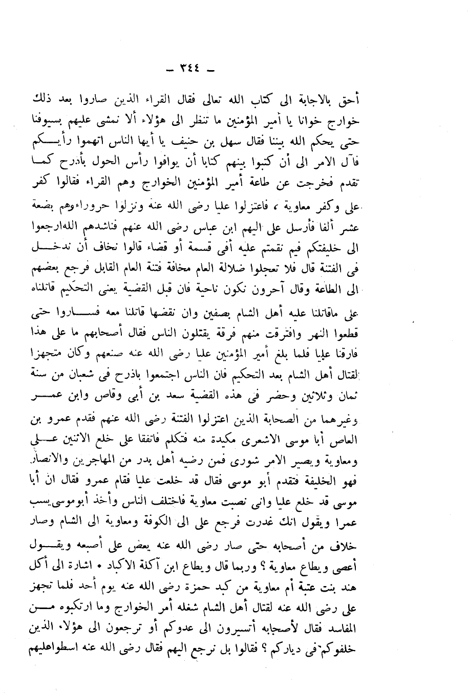 أَحَقُّ بِالْإِجَابَةِ إِلَى كِتَابِ اللَّهِ تَعَالَى. فَقَالَ الْقُرَّاءُ الَّذِينَ صَارُوا بَعْدَ ذَلِكَ خَوَارِجَ: خَوَّانًا يَا أَمِيرَ الْمُؤْمِنِينَ مَا تَنْظُرُ إِلَى هَؤُلَاءِ، أَلَا نَمْشِي عَلَيْهِمْ بِسُيُوفِنَا حَتَّى يَحْكُمَ اللَّهُ بَيْنَنَا، فَقَالَ سَهْلُ بْنُ حُنَيْفٍ: يَا أَيُّهَا النَّاسُ اتَّهِمُوا رَأْيَكُمْ. فَآلَ الْأَمْرُ إِلَى أَنْ كَتَبُوا بَيْنَهُمْ كِتَابًا أَنْ يُوَافُوا رَأْسَ الْحَوْلِ بِأَذْرُحَ كَمَا تَقَدَّمَ، فَخَرَجَتْ عَنْ طَاعَةِ أَمِيرِ الْمُؤْمِنِينَ الْخَوَارِجُ وَهُمُ الْقُرَّاءُ فَقَالُوا: كَفَرَ عَلِيٌّ وَكَفَرَ مُعَاوِيَةُ، فَاعْتَزَلُوا عَلِيًّا - رَضِيَ اللَّهُ عَنْهُ - وَنَزَلُوا حَرُورَاءَ وَهُمْ بِضْعَةَ عَشَرَ أَلْفًا، فَأَرْسَلَ عَلِيٌّ إِلَيْهِمُ ابْنَ عَبَّاسٍ - رَضِيَ اللَّهُ عَنْهُمَا - فَنَاشَدَهُمُ اللَّهَ ارْجِعُوا إِلَى خَلِيفَتِكُمْ فِيمَ نَقَمْتُمْ عَلَيْهِ أَفِي قِسْمَةٍ أَوْ قَضَاءٍ؟ قَالُوا: نَخَافُ أَنْ نَدْخُلَ فِي الْفِتْنَةِ. قَالَ: فَلَا تُعَجِّلُوا ضَلَالَةَ الْعَامِ مَخَافَةَ فِتْنَةِ الْعَامِ الْقَابِلِ، فَرَجَعَ بَعْضُهُمْ إِلَى الطَّاعَةِ، وَقَالَ آخَرُونَ: نَكُونُ نَاحِيَةً فَإِنْ قَبِلَ الْقَضِيَّةَ - يَعْنِي التَّحْكِيمَ - قَاتَلْنَاهُ عَلَى مَا قَاتَلْنَا عَلَيْهِ أَهْلَ الشَّامِ بِصِفِّينَ وَإِنْ نَقَضَهَا قَاتَلْنَا مَعَهُ.
