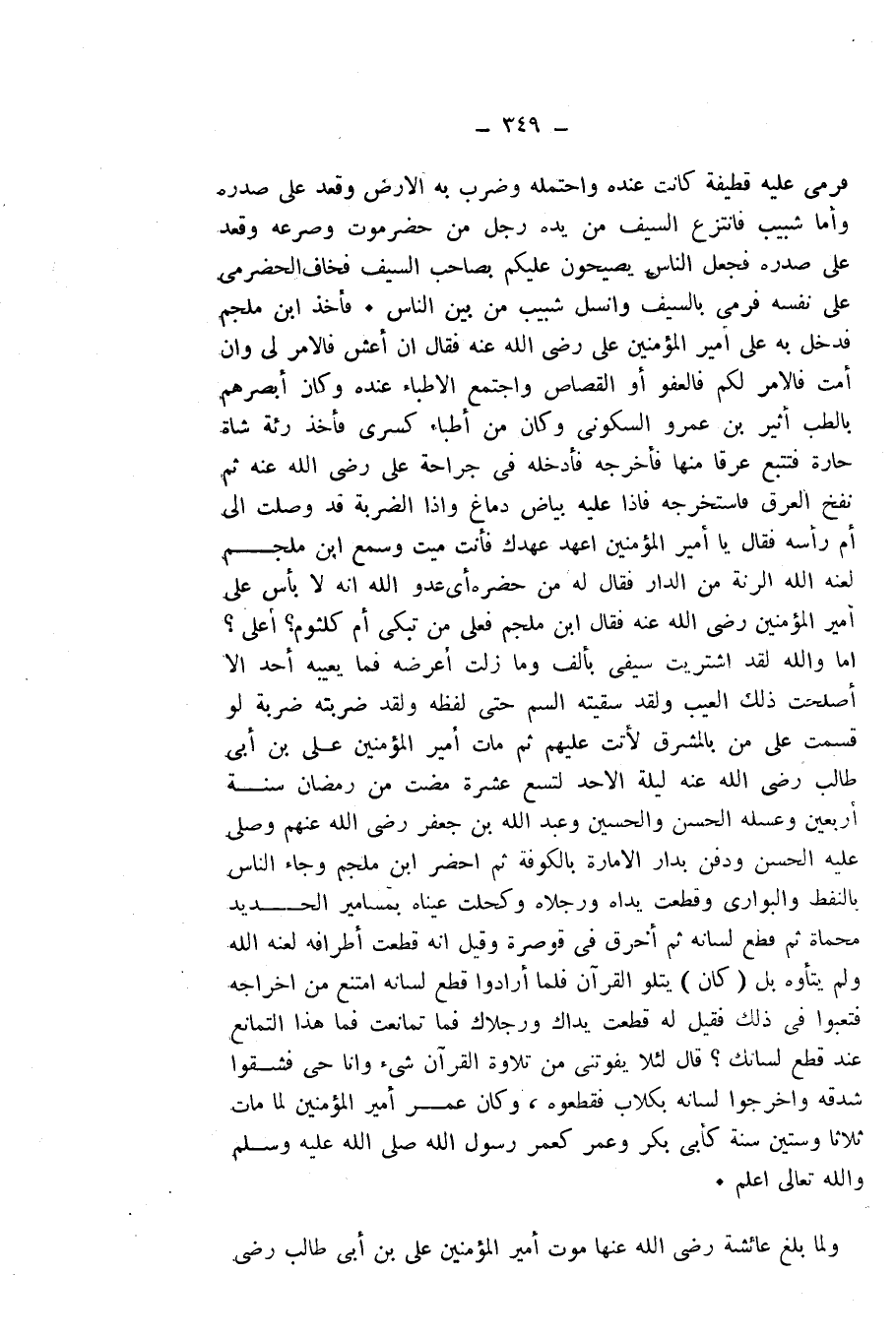 ثُمَّ مَاتَ أَمِيرُ الْمُؤْمِنِينَ عَلِيُّ بْنُ أَبِي طَالِبٍ - رَضِيَ اللَّهُ عَنْهُ - لَيْلَةَ الْأَحَدِ لِتِسْعَ عَشْرَةَ مَضَتْ مِنْ رَمَضَانَ سَنَةَ أَرْبَعِينَ، وَغَسَّلَهُ الْحَسَنُ وَالْحُسَيْنُ وَعَبْدُ اللَّهِ بْنُ جَعْفَرٍ - رَضِيَ اللَّهُ عَنْهُمْ - وَصَلَّى عَلَيْهِ الْحَسَنُ وَدُفِنَ بِدَارِ الْإِمَارَةِ بِالْكُوفَةِ، ثُمَّ أُحْضِرَ ابْنُ مُلْجَمٍ وَجَاءَ النَّاسُ بِالنِّفْطِ وَالْبَوَارِي وَقُطِعَتْ يَدَاهُ وَرِجْلَاهُ وَكُحِّلَتْ عَيْنَاهُ بِمَسَامِيرِ الْحَدِيدِ مُحْمَاةً، ثُمَّ قُطِعَ لِسَانُهُ ثُمَّ أُحْرِقَ فِي قَوْصَرَةٍ، وَقِيلَ إِنَّهُ قُطِعَتْ أَطْرَافُهُ - لَعَنَهُ اللَّهُ - وَلَمْ يَتَأَوَّهْ بَلْ (كَانَ) يَتْلُو الْقُرْآنَ فَلَمَّا أَرَادُوا قَطْعَ لِسَانِهِ امْتَنَعَ مِنْ إِخْرَاجِهِ فَتَعِبُوا فِي ذَلِكَ، فَقِيلَ لَهُ: قُطِعَتْ يَدَاكَ وَرِجْلَاكَ فَمَا تَمَانَعْتَ، فَمَا هَذَا التَّمَانُعُ عِنْدَ قَطْعِ لِسَانِكَ؟ قَالَ: لِئَلَّا يَفُوتَنِي مِنْ تِلَاوَةِ الْقُرْآنِ شَيْءٌ وَأَنَا حَيٌّ، فَشَقُّوا شِدْقَهُ وَأَخْرَجُوا لِسَانَهُ بِكُلَّابٍ فَقَطَعُوهُ.